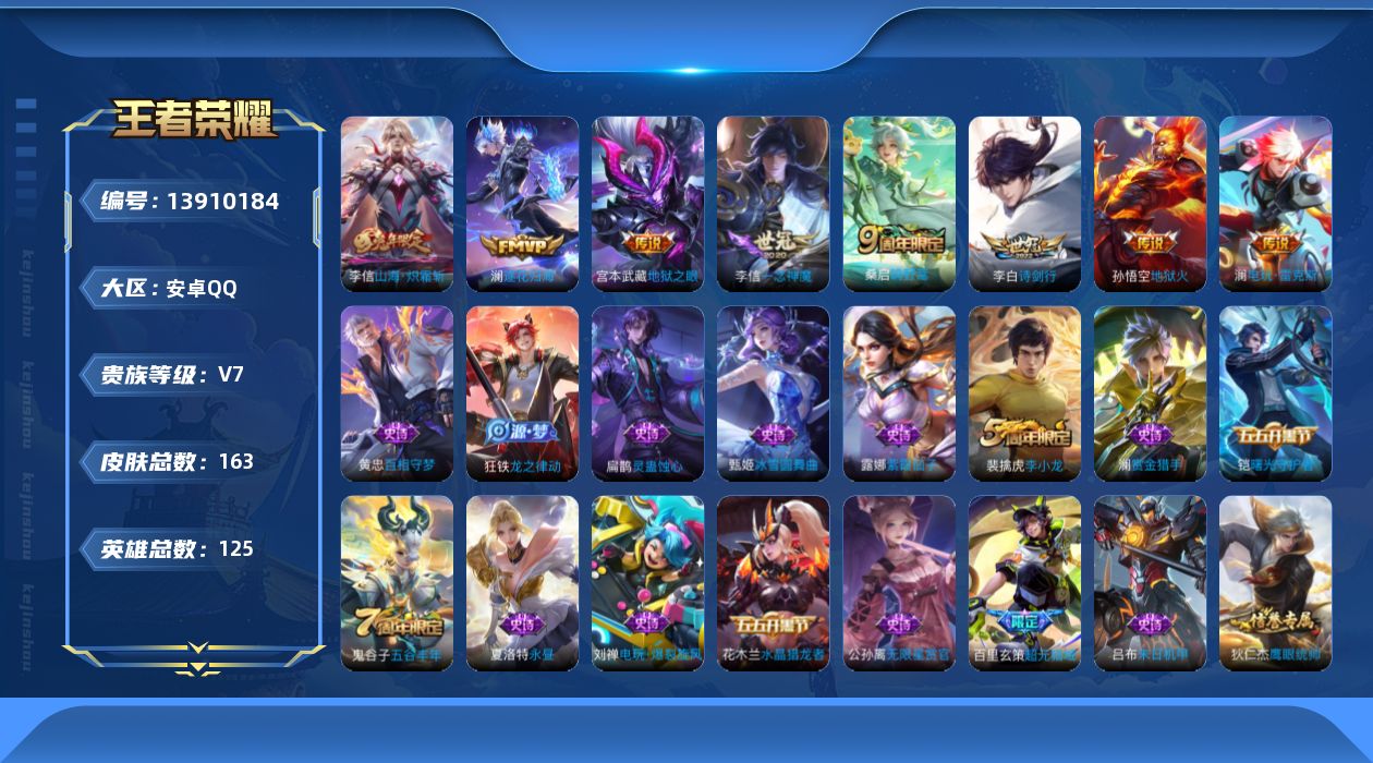 [13910184]可二次,【店主推荐捡漏号!可直接换绑】安卓Q-V7-至尊星耀I段位-125英雄-163皮肤-8传说-35史诗