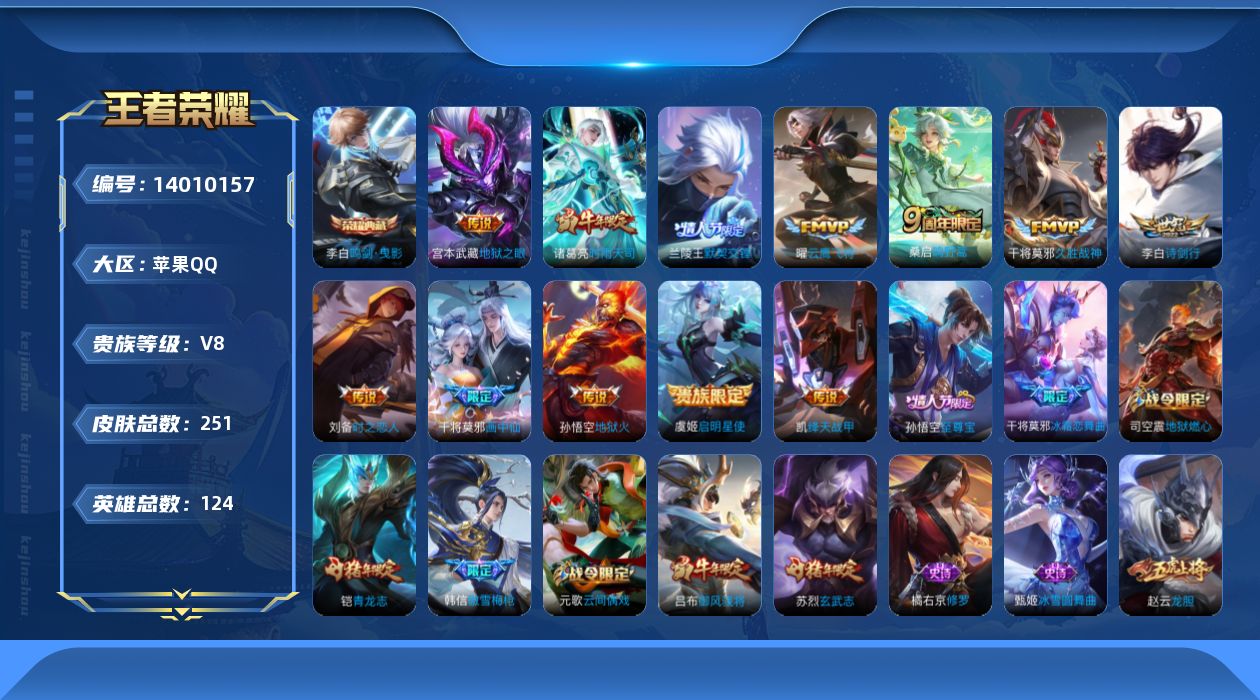 [14010157]【店主推荐捡漏号!可直接换绑】苹果Q-V8-永恒钻石V段位-123英雄-251皮肤-1典藏-12传说-66史诗