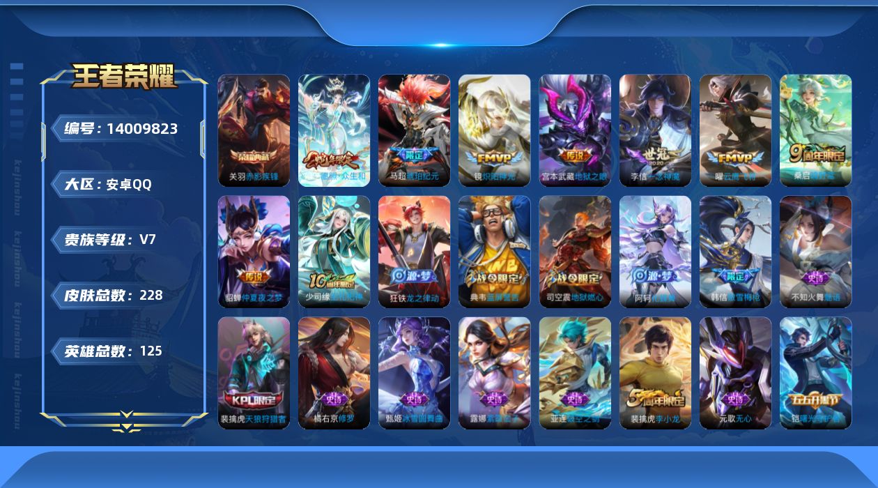 [14009823]可秒换绑 安卓Q-V7-永恒钻石II段位-125英雄-228皮肤-1典藏-8传说-59史诗 【英雄全皮】:影全皮 【荣耀典藏】:关羽赤影疾锋 【传说皮肤】:妲己愿照众生和,桑启鸣野蒿,马超琥珀纪元,镜炽阳神光,曜云鹰飞将,李信一念神魔,貂蝉仲夏夜之梦,宫本武藏地狱之眼 【限定皮肤】:蔡文姬夏日便利店,大乔绒语心约,虞姬夏日便利店,姜子牙天穹之誓,狄仁杰阴阳师,赵云皇家上将,孙尚香蔷薇恋人,高渐离玩趣恶龙,元歌无心,典韦蓝屏警告,狄仁杰魔术师,狄仁杰万华元夜,达摩沙漠行僧,项羽海滩派对,程咬金演武夺筹,韩信傲雪梅枪,兰陵王金庭之子,牛魔御旌,李元芳云中旅人,钟馗神迹守卫,钟馗驱傩正仪,女娲朔望之晖,鬼谷子原初探秘者,鬼谷子五谷丰年,苏烈千军破阵,沈梦溪大漠名商,裴擒虎天狼狩猎者,裴擒虎李小龙,裴擒虎擒涛扼浪,狂铁御狮,米莱狄御霄,云中君纤云弄巧,盾山御銮,嫦娥拒霜思,嫦娥暖冬兔眠,鲁班大师探海日志,桑启海盐诗旅,暃星界游侠,艾琳流音漫舞,司空震地狱燃心,阿古朵江河有灵,张良古海寻踪,蒙犽百解令,鬼谷子天穹祈灯,马超琥珀纪元,沈梦溪龙舞盛年,刘邦剑破天穹,程咬金群星魔术团,刘备异域游侠,周瑜熔金海岸 【赛季限定】:狄仁杰万华元夜,达摩沙漠行僧,程咬金演武夺筹,兰陵王金庭之子,张良古海寻踪,牛魔御旌,李元芳云中旅人,钟馗驱傩正仪,鬼谷子原初探秘者,苏烈千军破阵,沈梦溪大漠名商,裴擒虎擒涛扼浪,狂铁御狮,米莱狄御霄,盾山御銮,鲁班大师探海日志,桑启海盐诗旅,鬼谷子天穹祈灯,刘邦剑破天穹,姜子牙天穹之誓 【战令限定】:蔡文姬夏日便利店,虞姬夏日便利店,典韦蓝屏警告,艾琳流音漫舞,钟馗神迹守卫,女娲朔望之晖,嫦娥暖冬兔眠,司空震地狱燃心,暃星界游侠 【史诗皮肤】:露娜紫霞仙子,赵云皇家上将,赵云未来纪元,貂蝉圣诞恋歌,甄姬冰雪圆舞曲,狄仁杰魔术师,廉颇地狱岩魂,宫本武藏鬼剑武藏,孙尚香蔷薇恋人,孙尚香水果甜心,嬴政摇滚巨星,妲己魅力维加斯,妲己女仆咖啡,墨子龙骑士,墨子金属风暴,吕布圣诞狂欢,刘禅绅士熊喵,曹操幽灵船长,李白千年之狐,花木兰水晶猎龙者,刘邦德古拉伯爵,夏侯惇乘风破浪,小乔缤纷独角兽,兰陵王暗隐猎兽者,亚瑟心灵战警,雅典娜冰冠公主,安琪拉心灵骇客,百里守约特工魅影,铠曙光守护者,蔡文姬舞动绿茵,刘禅天才门将,李元芳逐浪之夏,白起星夜王子,阿轲节奏热浪,孙策猫狗日