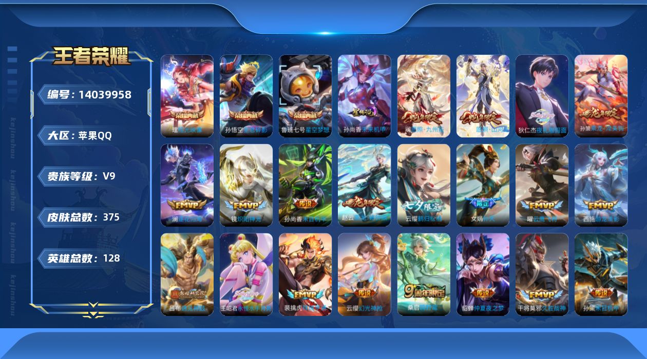 [14039958]【店主推荐捡漏号!可直接换绑】苹果Q-V9-至尊星耀I段位-128英雄-375皮肤-3典藏-31传说-108史诗