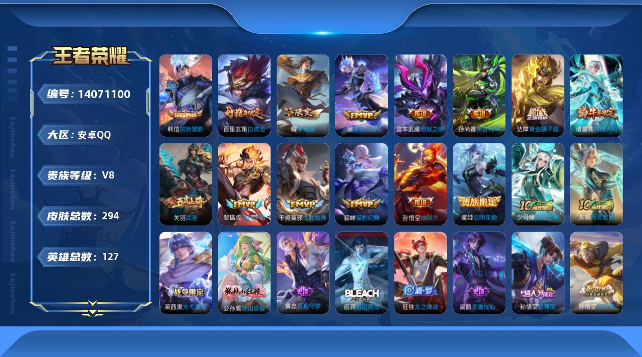 [14071100]【店主推荐捡漏号!可直接换绑】安卓Q-V8-最强王者段位-127英雄-294皮肤-1典藏-14传说-89史诗