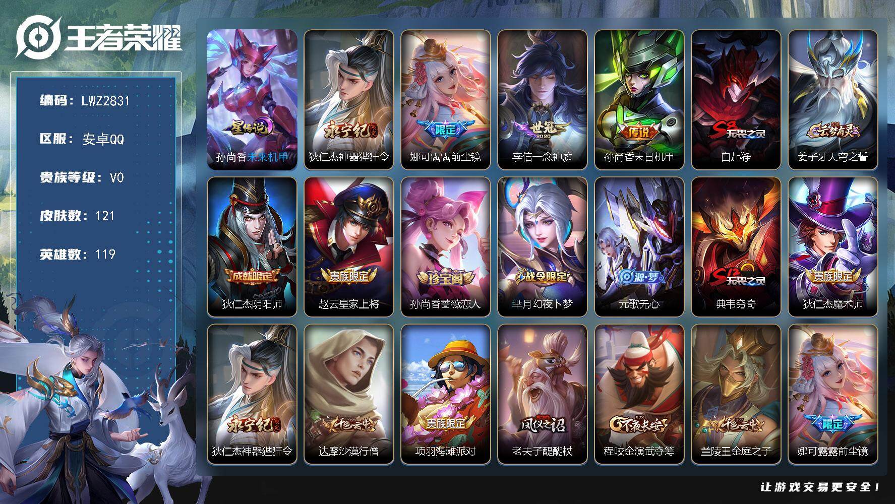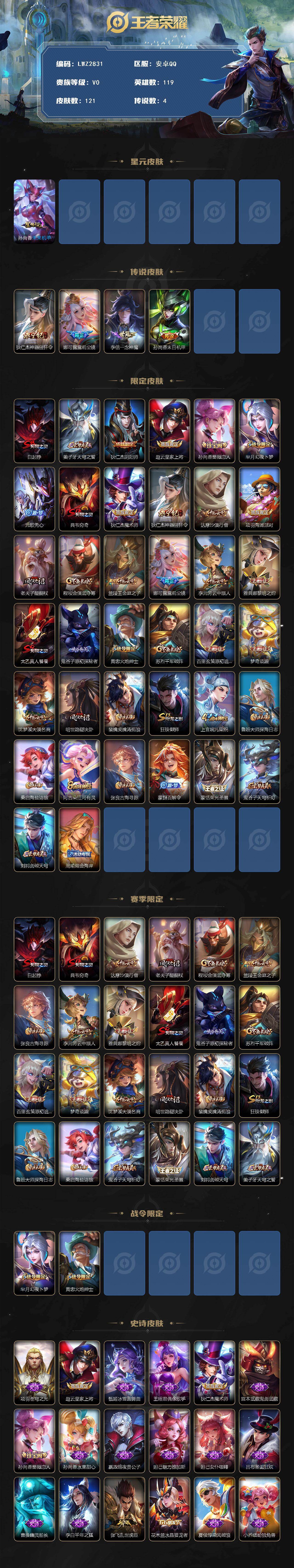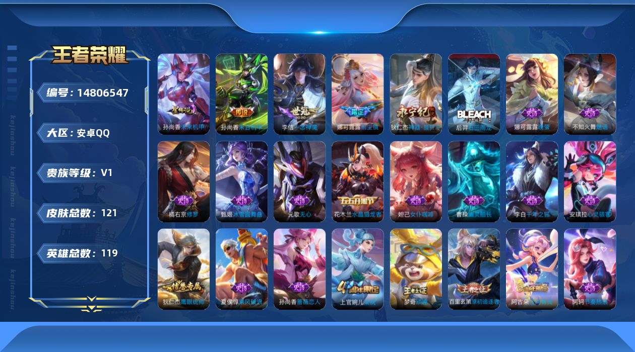 [14806547]【店主推荐捡漏号!可直接换绑】安卓Q-V6-最强王者段位-119英雄-121皮肤-4传说-36史诗-1星元 【英雄全皮】:娜可露露全皮 【传说皮肤】:狄仁杰神器狴犴令,娜可露露前尘镜,李信一念神魔,孙尚香末日机甲 【限定皮肤】:白起狰,姜子牙天穹之誓,狄仁杰阴阳师,赵云皇家上将,孙尚香蔷薇恋人,芈月幻夜卜梦,元歌无心,典韦穷奇,狄仁杰魔术师,狄仁杰神器狴犴令,达摩沙漠行僧,项羽海滩派对,老夫子醍醐杖,程咬金演武夺筹,兰陵王金庭之子,娜可露露前尘镜,李元芳云中旅人,雅典娜黎明之约,太乙真人饕餮,鬼谷子原初探秘者,黄忠火炮绅士,苏烈千军破阵,百里玄策原初追逐者,梦奇顽趣,沈梦溪大漠名商,明世隐疑决卦,裴擒虎擒涛扼浪,狂铁御狮,上官婉儿梁祝,鲁班大师探海日志,桑启海盐诗旅,阿古朵江河有灵,张良古海寻踪,蒙犽百解令,蒙恬荣光圣徽,鬼谷子天穹祈灯,刘邦剑破天穹,周瑜熔金海岸 【赛季限定】:白起狰,典韦穷奇,达摩沙漠行僧,老夫子醍醐杖,程咬金演武夺筹,兰陵王金庭之子,张良古海寻踪,李元芳云中旅人,雅典娜黎明之约,太乙真人饕餮,鬼谷子原初探秘者,苏烈千军破阵,百里玄策原初追逐者,梦奇顽趣,沈梦溪大漠名商,明世隐疑决卦,裴擒虎擒涛扼浪,狂铁御狮,鲁班大师探海日志,桑启海盐诗旅,鬼谷子天穹祈灯,蒙恬荣光圣徽,刘邦剑破天穹,姜子牙天穹之誓 【战令限定】:芈月幻夜卜梦,黄忠火炮绅士 【史诗皮肤】:项羽苍穹之光,赵云皇家上将,甄姬冰雪圆舞曲,王昭君偶像歌手,狄仁杰魔术师,宫本武藏鬼剑武藏,孙尚香蔷薇恋人,孙尚香水果甜心,嬴政暗夜贵公子,妲己魅力维加斯,妲己女仆咖啡,吕布圣诞狂欢,曹操幽灵船长,李白千年之狐,张飞乱世虎臣,花木兰水晶猎龙者,夏侯惇乘风破浪,小乔缤纷独角兽,安琪拉心灵骇客,李元芳逐浪之夏,程咬金功夫厨神,阿轲节奏热浪,狄仁杰鹰眼统帅,上官婉儿梁祝,娜可露露晚萤,不知火舞魅语,橘右京修罗,百里玄策原初追逐者,黄忠火炮绅士,雅典娜黎明之约,元歌无心,梦奇顽趣,阿古朵江河有灵,蒙犽百解令,蒙恬荣光圣徽,后羿石田雨龙 【其他皮肤】:项羽海滩派对,韩信教廷特使,韩信街头霸王,露娜哥特玫瑰,阿轲爱心护理,达摩大发明家,赵云忍炎影,扁鹊化身博士,亚瑟死亡骑士,花木兰兔女郎,张飞五福同心,甄姬花好人间,宫本武藏万象初新,后羿阿尔法小队,狄仁杰阴阳师,刘备汉昭烈帝,白起狰,太乙真人饕餮,王昭君