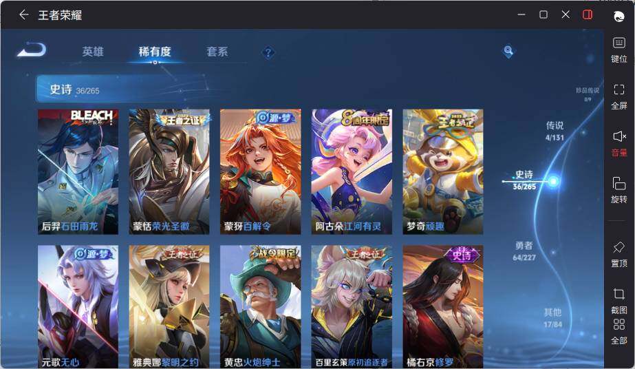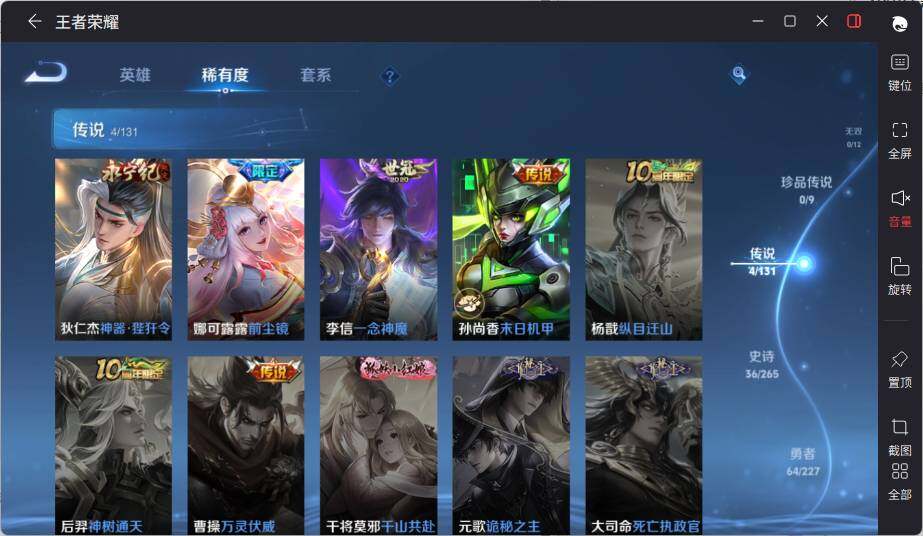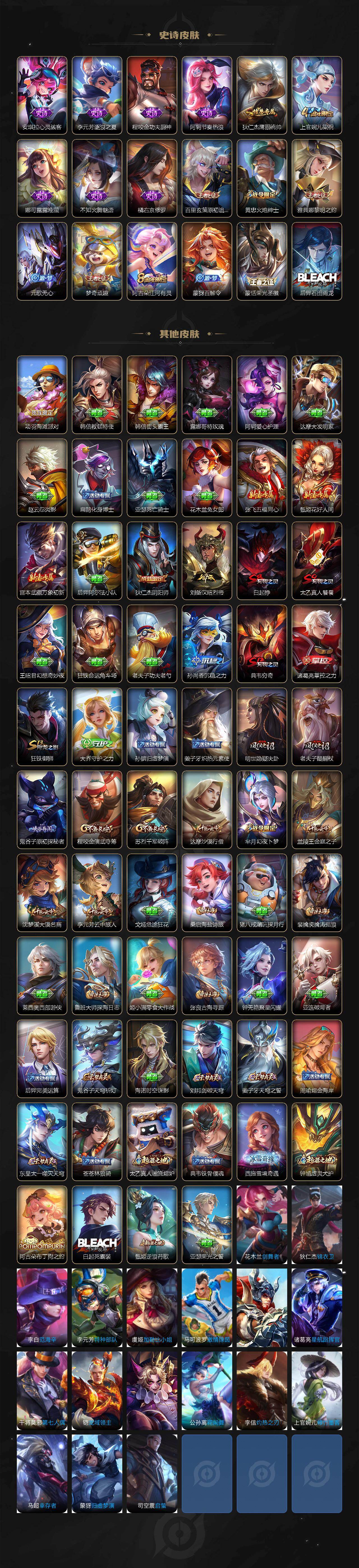 【史诗皮肤】:项羽苍穹之光,赵云皇家上将,甄姬冰雪圆舞曲,王昭君偶像歌手,狄仁杰魔术师,宫本武藏鬼剑武藏,孙尚香蔷薇恋人,孙尚香水果甜心,嬴政暗夜贵公子,妲己魅力维加斯,妲己女仆咖啡,吕布圣诞狂欢,曹操幽灵船长,李白千年之狐,张飞乱世虎臣,花木兰水晶猎龙者,夏侯惇乘风破浪,小乔缤纷独角兽,安琪拉心灵骇客,李元芳逐浪之夏,程咬金功夫厨神,阿轲节奏热浪,狄仁杰鹰眼统帅,上官婉儿梁祝,娜可露露晚萤,不知火舞魅语,橘右京修罗,百里玄策原初追逐者,黄忠火炮绅士,雅典娜黎明之约,元歌无心,梦奇顽趣,阿古朵江河有灵,蒙犽百解令,蒙恬荣光圣徽,后羿石田雨龙