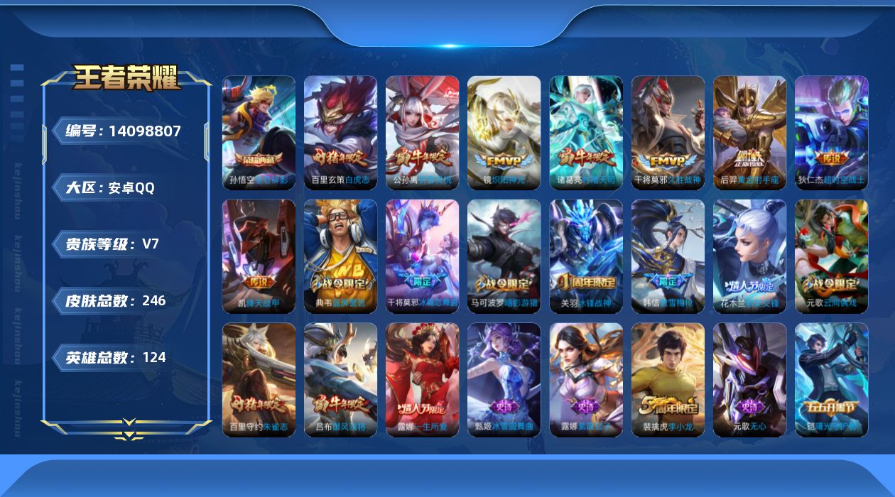 - [11867621]V7 10传说 122英雄 239皮肤 可修改实名 优质装备:云霓雀翎,末日机甲-孙尚香(绿蚂蚱),地狱之眼,超时空战士-狄仁杰,霜月吟,涂山容容 传说皮:九山相柳,祥瑞亨通,幻光神枪 珍宝阁皮:蔷薇恋人 限定皮:逐霄战戟,鸣野蒿,诗剑行,降魔,五谷丰年,岱宗(典韦年限),李小龙 史诗皮:鸭鸭历险记-刘禅,狼魂孤将,绮世丹青,瑰影绮梦,化蝶舞,星界战将,龙之律动,百相守梦-周瑜,茶境仙,破空之剑,琥珀纪元伽罗,蔬乡物语(鲁班七号),百相守梦-百里守约,星界特工,百相守梦-黄忠,紫霞仙子,黄金分割率,江河有灵,百解令(蒙犽),高渐离燃音魔法,冰冠公主,青蛇,偶像歌手,电玩·爆裂旋风,末日机甲-吕布,节奏热浪,女仆咖啡,水果甜心,天才门将,星夜王子,心灵骇客,功夫厨神,德古拉伯爵,暗隐猎兽者,幽灵船长,鬼剑武藏,乐园奇幻夜,地狱岩魂,纤云弄巧,拒霜思,缤纷独角兽,逐浪之夏,水晶猎龙者,金属风暴,圣诞狂欢,圣诞恋歌,鹰眼统帅,魅力维加斯,未来纪元-赵云