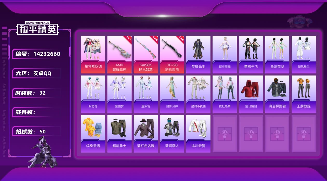 [14232660]可二次【店主推荐捡漏号!可直接换绑】 安卓 手Q-1粉装-3特效枪-1粉色飞行器-1.5w热力值-2王牌印记-32套装-50枪皮【粉色套装】:粉装-星穹咏叹调【粉色枪皮等级】:Kar98K-巳巳如意(五级),AMR-智耀战神(七级),DP-28-豹影疾电(四级)【粉色飞行器】:镜光幻境飞行翼