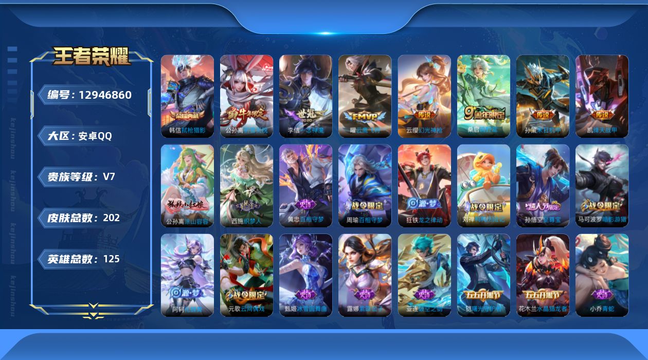 [12946860]安卓Q-V7-至尊星耀II段位-124英雄-193皮肤-1典藏-7传说-46史诗 【英雄全皮】:空空儿全皮,影全皮 【荣耀典藏】:韩信弑枪猎影 【传说皮肤】:云缨幻光神枪,桑启鸣野蒿,孙策末日机甲,公孙离祈雪灵祝,铠绛天战甲,曜云鹰飞将,李信一念神魔 【限定皮肤】:大乔绒语心约,姜子牙天穹之誓,狄仁杰阴阳师,赵云皇家上将,阿轲迷踪丽影,元歌云间偶戏,马可波罗暗影游猎,狄仁杰魔术师,达摩沙漠行僧,项羽海滩派对,孙悟空至尊宝,李元芳银河之约,百里玄策原初追逐者,公孙离祈雪灵祝,沈梦溪大漠名商,裴擒虎擒涛扼浪,西施玲珑珍味,鲁班大师探海日志,桑启海盐诗旅,艾琳女武神,阿古朵江河有灵,张良古海寻踪,高渐离燃音魔法,妲己灵卜魔法,鬼谷子天穹祈灯,沈梦溪龙舞盛年,刘邦剑破天穹,程咬金群星魔术团,周瑜熔金海岸 【年限皮肤】:公孙离祈雪灵祝 【赛季限定】:达摩沙漠行僧,张良古海寻踪,百里玄策原初追逐者,沈梦溪大漠名商,裴擒虎擒涛扼浪,鲁班大师探海日志,桑启海盐诗旅,鬼谷子天穹祈灯,刘邦剑破天穹,姜子牙天穹之誓 【战令限定】:阿轲迷踪丽影,元歌云间偶戏,马可波罗暗影游猎,李元芳银河之约,西施玲珑珍味,高渐离燃音魔法,妲己灵卜魔法 【史诗皮肤】:露娜紫霞仙子,赵云皇家上将,赵云未来纪元,貂蝉圣诞恋歌,甄姬冰雪圆舞曲,王昭君偶像歌手,狄仁杰魔术师,廉颇地狱岩魂,宫本武藏鬼剑武藏,孙尚香水果甜心,嬴政摇滚巨星,妲己魅力维加斯,吕布圣诞狂欢,孙悟空至尊宝,花木兰水晶猎龙者,夏侯惇乘风破浪,兰陵王暗隐猎兽者,雅典娜冰冠公主,安琪拉心灵骇客,百里守约特工魅影,铠曙光守护者,李元芳逐浪之夏,阿轲节奏热浪,大乔猫狗日记,伽罗箭羽风息,狄仁杰鹰眼统帅,李元芳银河之约,小乔青蛇,阿轲迷踪丽影,马可波罗暗影游猎,百里玄策原初追逐者,元歌云间偶戏,沈梦溪月团寄思,阿古朵江河有灵,妲己灵卜魔法,高渐离燃音魔法,亚连破空之剑,百里守约百相守梦,牛魔星界战将,孙膑茶境仙,阿轲化蝶舞,刘禅鸭鸭历险记,狂铁龙之律动,周瑜百相守梦,黄忠百相守梦,西施织梦人,公孙离涂山容容 【其他皮肤】:项羽海滩派对,韩信教廷特使,阿轲爱心护理,赵云忍炎影,艾琳女武神,程咬金星际陆战队,白起白色死神,牛魔西部大镖客,孙膑天使之翼,妲己少女阿狸,典韦黄金武士,亚瑟死亡骑士,达摩拳王,花木兰兔女郎,张飞五福同心,甄姬花好人间,宫本武藏万象