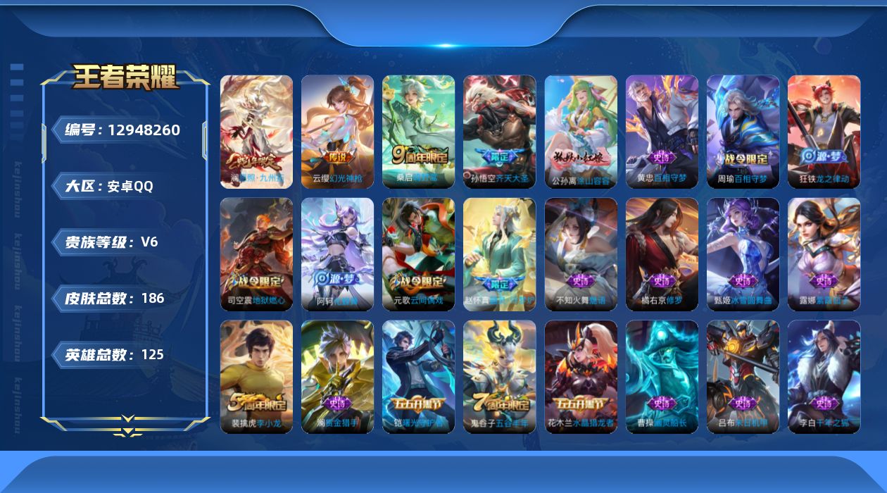 [12948260]【特价急出/详情看图】:安卓Q-V6-最强王者段位-125英雄-186皮肤-4传说-46史诗