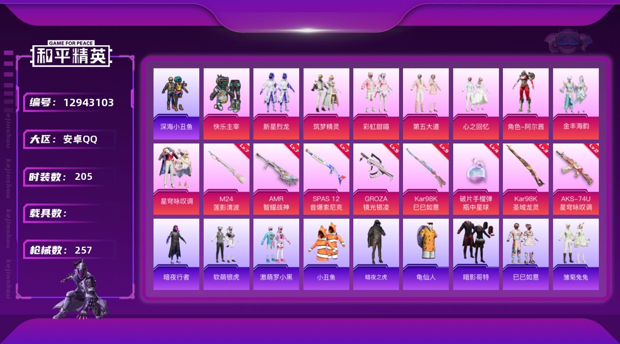 - [13782912]安卓 手Q-2粉装-3特效枪-0载具-1粉色飞行器-38526热力值-4王牌印记-108套装-133枪皮 【热门品类】:套装-龟仙人,套装-暗影哥特,套装-粉红小猪,角色-Mark.06 【粉色套装】:粉装-仲夏莫吉托,角色-守护天翼 【粉色枪皮等级】:AKM-绿萝繁花(五级),Kar98K-巳巳如意(五级),DP-28-豹影疾电(五级) 【粉色枪皮】:AKM-绿萝繁花,Kar98K-巳巳如意,DP-28-豹影疾电 【粉色飞行器】:英伦信使飞行器 【粉色降落伞】:垂柳戏鸭降落伞,旋转彩虹降落伞,炎氏战神降落伞,闲梦青缨降落伞,猪猪侠降落伞,精灵梦叶罗丽降落伞,忍者神龟降落伞,千金淑猫降落伞,临安公主降落伞,喜羊羊与灰太狼降落伞 【稀有套装】:套装-龟仙人,套装-雏菊兔兔,套装-萝兰蝴蝶,套装-小熊娃娃,套装-糖糖葫芦,套装-青团波波,套装-棉花软糖,角色-都市丽猫,角色-摩登魅猫,套装-燕燕于飞,套装-鱼渊荷华,套装-星影赞美诗 【稀有枪皮】:AKM-2P战斗服款,AKM-彩虹符号,AKM-破晓战魂,AKM-龙的传人,M16A4-幻世战舞者,M16A4-红色方程式,M16A4-蓝色火焰,SCAR-L-炫彩节奏,SCAR-L-玉兔迎春,SCAR-L-红色方程式,M416-糯团青竹,M416-红色方程式,M416-蓝色火焰,GROZA-彩虹符号,GROZA-田园牧歌,AUG-2P战斗服款,AUG-天降萌叽,AUG-耀粉歌者,AUG-闲梦青缨,M762-天降萌叽,AC-VAL-天降萌叽,蜜獾-天降萌叽,蜜獾-娇憨猪猪,蜜獾-绯穹魔姬,UZI-天降萌叽,UZI-娇憨猪猪,UZI-红色方程式,UMP45-夜灯,UMP45-涂山之恋,UMP45-炫光之旅,UMP45-生命誓言,UMP45-蓝色火焰,UMP45-绒宝小鹅,Vector-彩虹符号,Vector-田园牧歌,汤姆逊-天降萌叽,汤姆逊-炫彩节奏,汤姆逊-耀粉歌者,P90-巳巳如意,Kar98K-影袭,Kar98K-红色方程式,SKS-未来歌姬,VSS-彩虹符号,VSS-田园牧歌,Mini14-耀粉歌者,Mini14-金鼠迎春,SLR-娇憨猪猪,AMR-喜羊羊与灰太狼,M417-惊鸿侠骨,MK20-H-莲影清波,M200-惊鸿侠骨,S686-红色方程式,S1897-炫彩节奏,S12K-玩趣呆呆,S12K-破晓战魂,S12