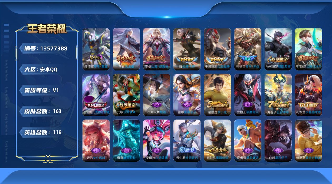 [13577388]可二次【店主推荐捡漏号!可直接换绑】:安卓Q-V6-尊贵铂金I段位-114英雄-163皮肤-1星元-5传说-44史诗