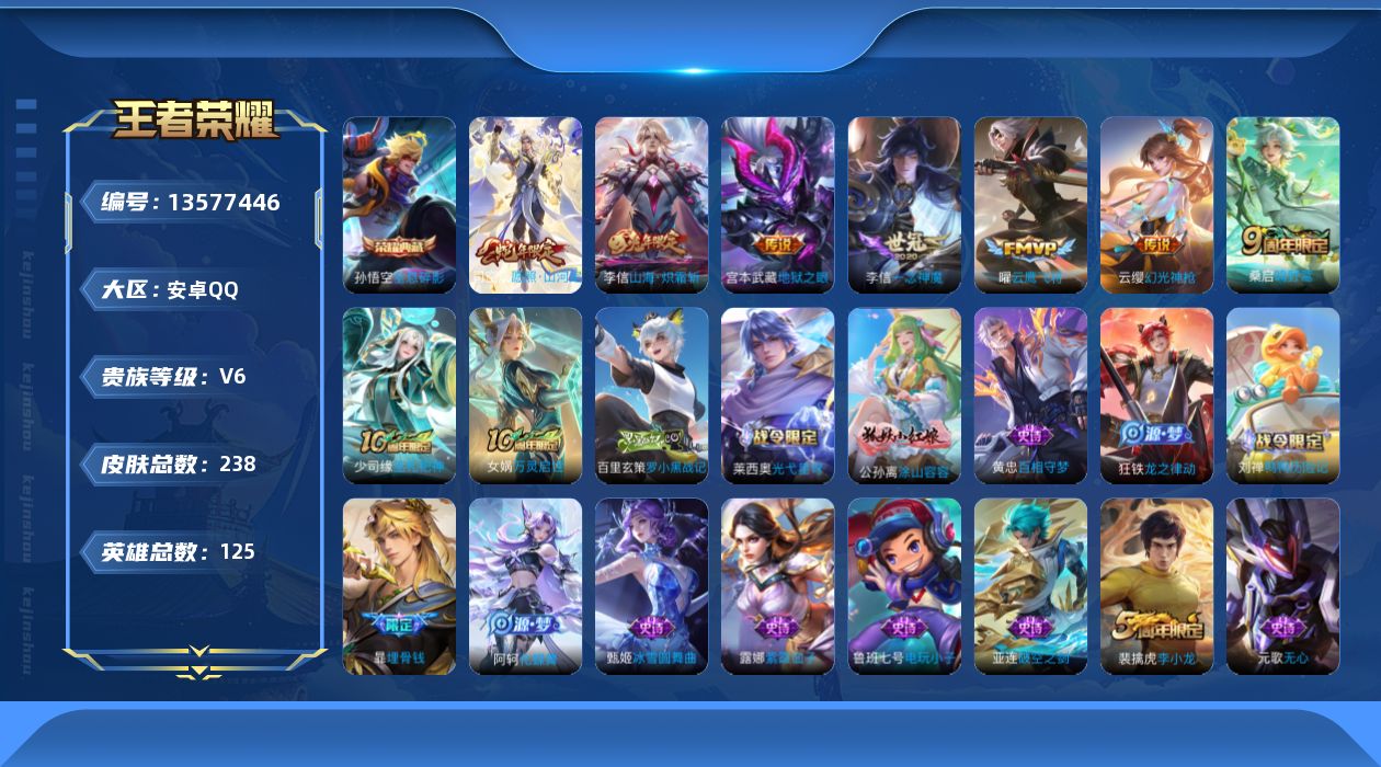 [13577446]【店主推荐捡漏号!有二次可直接换绑】安卓Q-V6-最强王者段位-125英雄-238皮肤-1典藏-7传说-62史诗