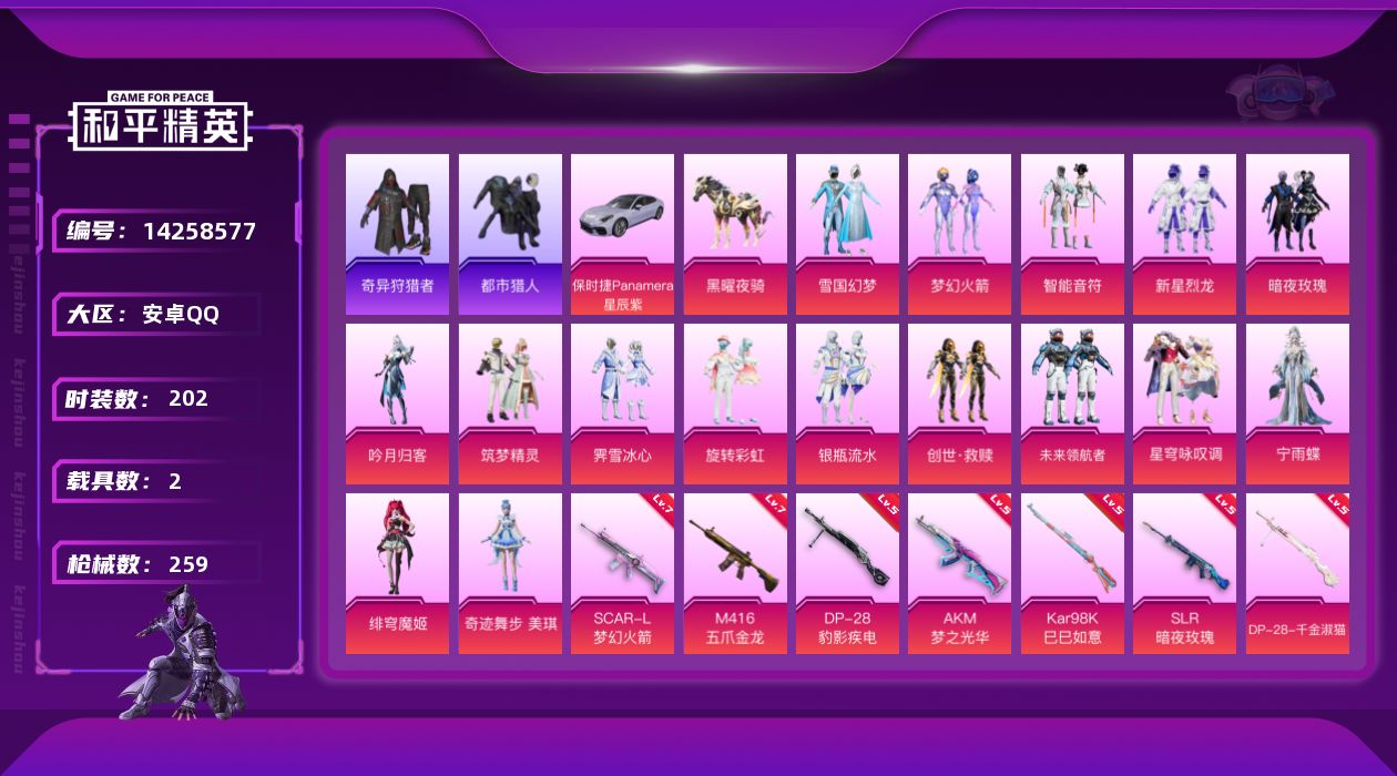 [14258577]【店主推荐捡漏号!可直接换绑】/素材身法号/绝世印记1 安卓 手Q-16粉装-9特效枪-2载具-5粉色飞行器-8.9w热力值-14王牌印记-202套装-259枪皮【热门品类】:粉装-雪国幻梦,粉装-梦幻火箭,套装-浪漫天命,套装-都市猎人,套装-小丑鱼,套装-奇异狩猎者,角色-军刀雅典娜,套装-龟仙人,套装-暗影哥特,角色-8号机,角色-Mark.06【粉色载具】:保时捷Panamera(星辰紫),黑曜夜骑【粉色套装】:粉装-雪国幻梦,粉装-梦幻火箭,粉装-智能音符,粉装-新星烈龙,粉装-暗夜玫瑰,粉装-吟月归客,粉装-筑梦精灵,粉装-霁雪冰心,粉装-旋转彩虹,粉装-银瓶流水,套装-创世·救赎,粉装-未来领航者,粉装-星穹咏叹调,角色-宁雨蝶,角色-绯穹魔姬,角色-奇迹舞步 美琪【粉色枪皮等级】:AKM-梦之光华(五级),SCAR-L-梦幻火箭(七级),M416-五爪金龙(七级),M416-灵猫魔法师(三级),AKS-74U-星穹咏叹调(四级),Kar98K-巳巳如意(五级),SLR-暗夜玫瑰(五级),DP-28-千金淑猫(五级),DP-28-豹影疾电(五级)【粉色飞行器】:梦幻火箭飞行器,圣域金龙飞行器,灵猫魔法师飞行器,灵珠游龙飞行器