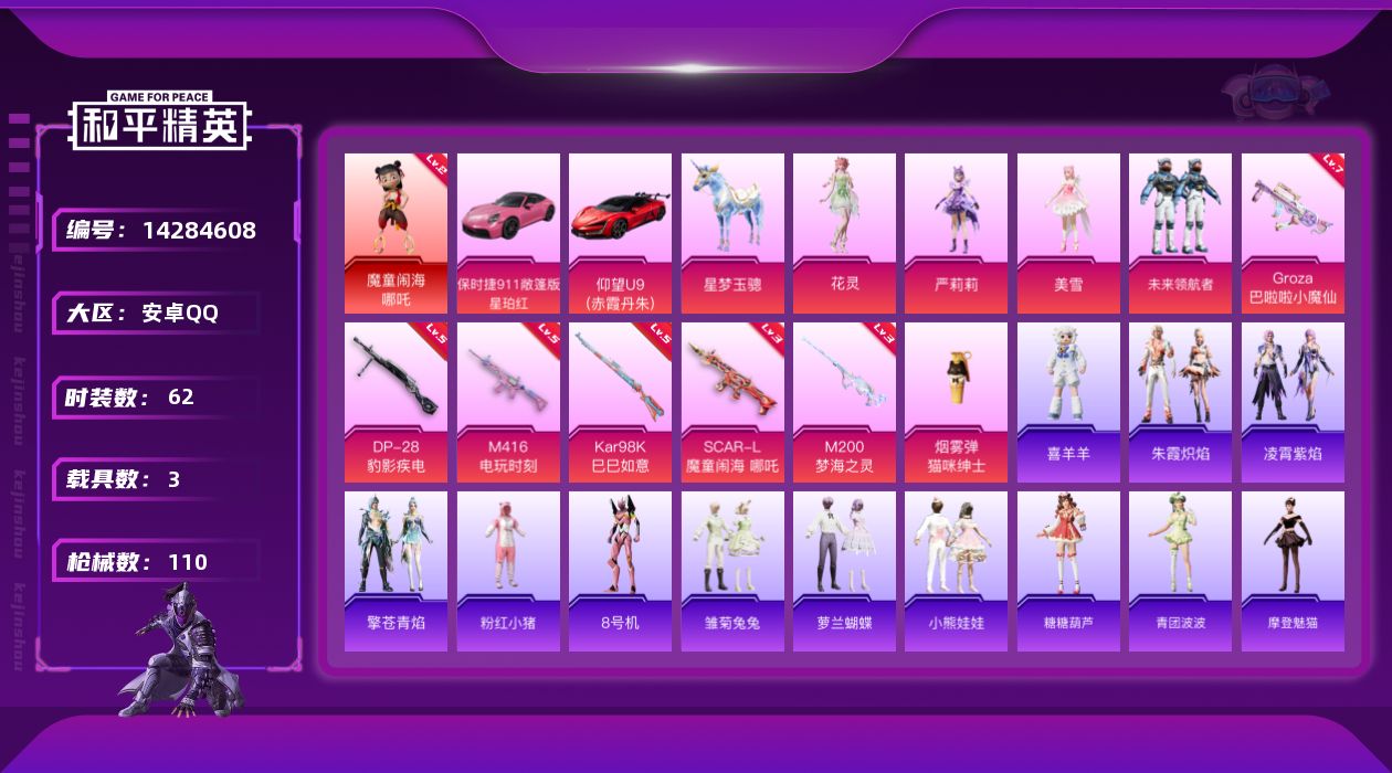 [14284608]可二次【店主推荐捡漏号!可直接换绑】/素材身法号/绝世印记1/扭蛋碎片670 安卓 手Q-1神装-4粉装-7特效枪-3载具-3粉色飞行器-3.8w热力值-3王牌印记-62套装-110枪皮【红色神装等级】:魔童闹海-哪吒(二级)【热门品类】:套装-粉红小猪,角色-8号机【粉色载具】:仰望U9(赤霞丹朱),保时捷911 敞篷版(星珀红),星梦玉骢【粉色套装】:角色-严莉莉,角色-美雪,粉装-未来领航者,角色-花灵【粉色枪皮等级】:SCAR-L-魔童闹海 哪吒(三级),M416-电玩时刻(五级),GROZA-巴啦啦小魔仙(七级),Kar98K-巳巳如意(五级),M200-梦海之灵(三级),DP-28-豹影疾电(五级)【粉色飞行器】:幻海精灵飞行器,飞天猪飞行器