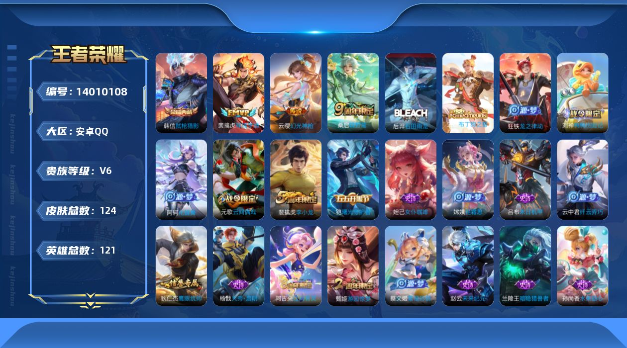 [14010108]【特价急出/详情看图】安卓Q-V6-至尊星耀V段位-120英雄-124皮肤-1典藏-3传说-33史诗