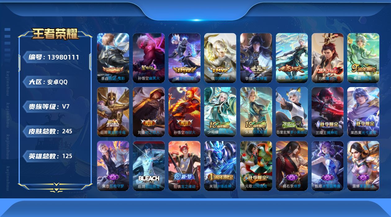 [13980111]【店主推荐捡漏号!可直接换绑/2市标】:安卓Q-V7-最强王者段位-125英雄-245皮肤-1典藏-1星元-10传说-60史诗