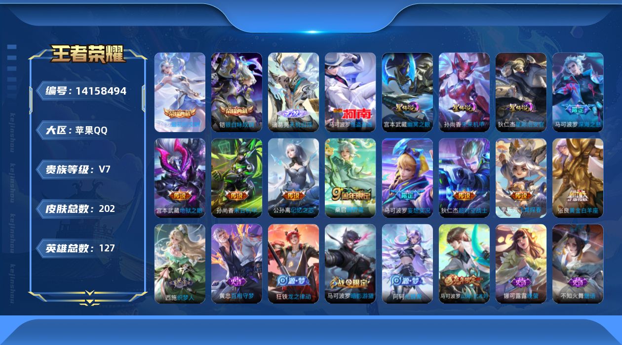 [14158494]可二次【店主推荐捡漏号!可直接换绑】,小国服1.3w狄仁杰,金标1.2w马可波罗,发育路67段,打野32段,苹果Q-V7-最强王者段位-127英雄-202皮肤-2典藏-3星传说-1无双-1珍品传说-9传说-61史诗