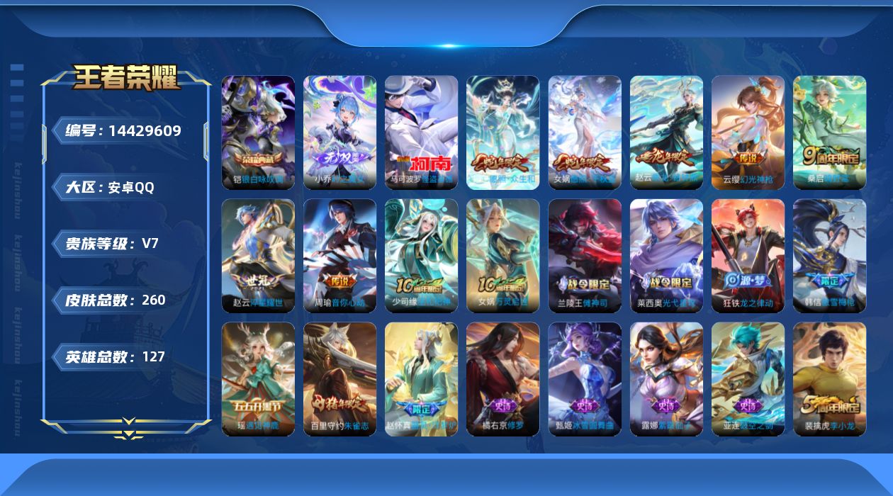 - [11864080]V7 1典藏 1无双 5传说 125英雄 251皮肤 可修改实名 优质装备:幻阙歌(貂蝉典藏),韩信群星魔术团(韩信无双),黄金射手座,无双飞将 珍宝阁皮:妄想食味,优雅恋人,蔷薇恋人 限定皮:鸣野蒿,至尊宝,神威(电光马子),飞衡(韩信年限),高山流水,诗剑行,齐天大圣,五谷丰年,青龙志(铠年限),梁祝,李小龙,逐梦之影 史诗皮:灵蛊蚀心,星界战将,埋骨钱,百相守梦-百里守约,百相守梦-黄忠,电玩小子(小书包),白龙吟,特工魅影,江河有灵,百解令(蒙犽),高渐离燃音魔法,蒙恬荣光圣徽,电玩·爆裂旋风,猫狗日记-孙策,乱世虎臣,摇滚巨星,水果甜心,绅士熊喵,天才门将,暗隐猎兽者,鬼剑武藏,舞动绿茵,地狱岩魂,繁星吟游(呼啦呼啦),拒霜思,缤纷独角兽,乘风破浪,逐浪之夏,箭羽风息,金属风暴,圣诞狂欢,圣诞恋歌,鹰眼统帅,魅力维加斯,黎明之约,无心,未来纪元-赵云