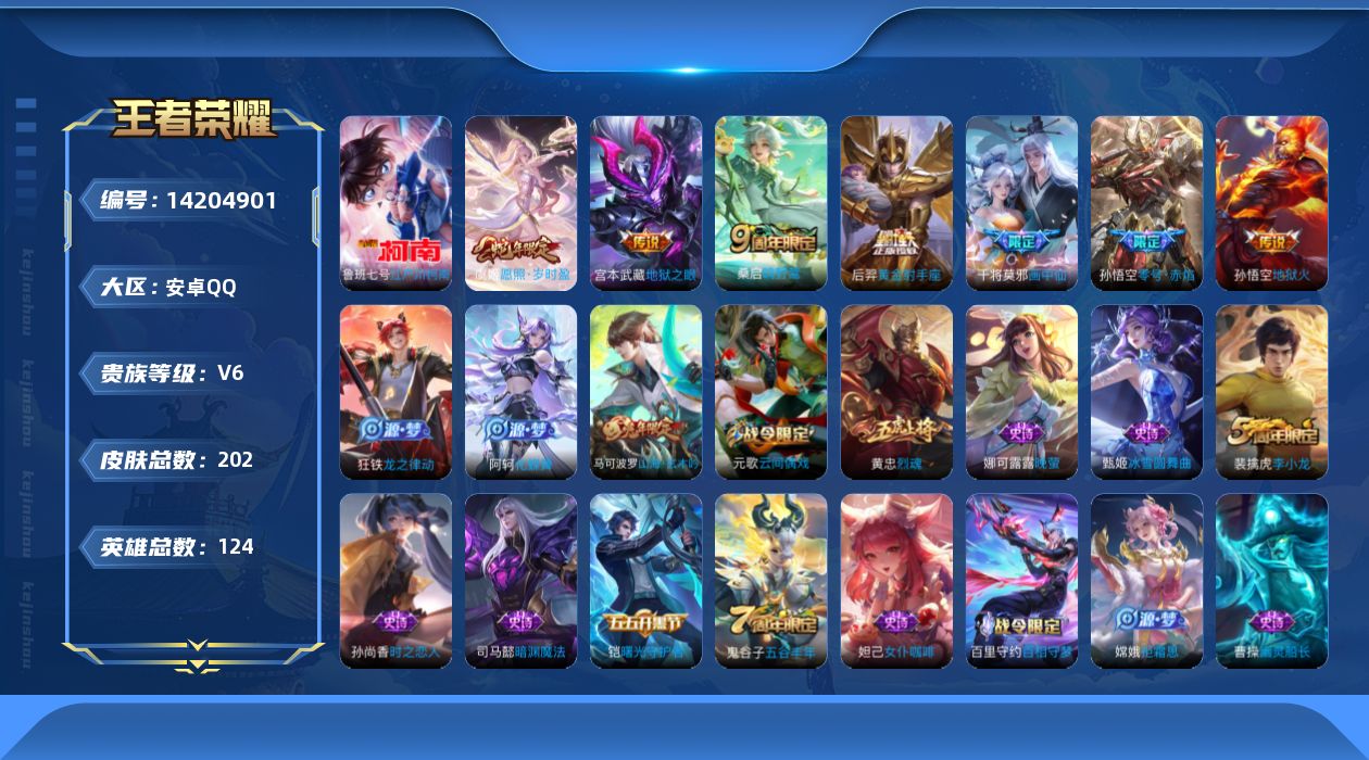 [14204901]可二次【店主推荐捡漏号!可直接换绑】安卓Q-V6-尊贵铂金II段位-124英雄-201皮肤-1珍品传说-7传说-49史诗 【珍品传说】:鲁班七号江户川柯南 【传说皮肤】:虞姬愿照岁时盈,桑启鸣野蒿,干将莫邪画中仙,孙悟空零号赤焰,后羿黄金射手座,宫本武藏地狱之眼,孙悟空地狱火 【限定皮肤】:狄仁杰阴阳师,赵云皇家上将,墨子神迹守卫,孙尚香蔷薇恋人,庄周高山流水,高渐离玩趣恶龙,元歌云间偶戏,马可波罗山海玄木吟,狄仁杰魔术师,狄仁杰万华元夜,达摩沙漠行僧,项羽海滩派对,老夫子航海奇遇记,程咬金演武夺筹,韩信逐梦之影,兰陵王金庭之子,亚瑟潮玩骑士王,孙悟空零号赤焰,牛魔奔雷神使,后羿圣弓游侠,李元芳云中旅人,钟馗驱傩正仪,干将莫邪真爱魔法,干将莫邪画中仙,雅典娜单词大作战,蔡文姬繁星吟游,鬼谷子原初探秘者,鬼谷子五谷丰年,黄忠烈魂,苏烈千军破阵,沈梦溪大漠名商,裴擒虎李小龙,嫦娥拒霜思,嫦娥暖冬兔眠,蒙犽狂想玩偶喵,鲁班大师探海日志,桑启海盐诗旅,阿古朵江河有灵,张良古海寻踪,蒙犽百解令,鬼谷子天穹祈灯,沈梦溪龙舞盛年,刘邦剑破天穹,程咬金群星魔术团,镜青焰无极,项羽苍威无极,刘备异域游侠 【年限皮肤】:牛魔奔雷神使,黄忠烈魂,马可波罗山海玄木吟 【赛季限定】:狄仁杰万华元夜,达摩沙漠行僧,程咬金演武夺筹,兰陵王金庭之子,张良古海寻踪,李元芳云中旅人,钟馗驱傩正仪,鬼谷子原初探秘者,苏烈千军破阵,沈梦溪大漠名商,鲁班大师探海日志,桑启海盐诗旅,鬼谷子天穹祈灯,刘邦剑破天穹 【战令限定】:墨子神迹守卫,元歌云间偶戏,老夫子航海奇遇记,亚瑟潮玩骑士王,后羿圣弓游侠,干将莫邪真爱魔法,雅典娜单词大作战,嫦娥暖冬兔眠,蒙犽狂想玩偶喵,镜青焰无极,项羽苍威无极 【史诗皮肤】:赵云皇家上将,貂蝉圣诞恋歌,甄姬冰雪圆舞曲,王昭君偶像歌手,狄仁杰魔术师,宫本武藏鬼剑武藏,孙尚香蔷薇恋人,孙尚香水果甜心,嬴政摇滚巨星,妲己女仆咖啡,墨子金属风暴,吕布圣诞狂欢,曹操幽灵船长,韩信逐梦之影,夏侯惇乘风破浪,诸葛亮黄金分割率,雅典娜冰冠公主,百里守约特工魅影,铠曙光守护者,刘禅天才门将,李元芳逐浪之夏,白起星夜王子,阿轲节奏热浪,孙策猫狗日记,大乔猫狗日记,狄仁杰鹰眼统帅,蔡文姬繁星吟游,娜可露露晚萤,黄忠烈魂,孙尚香时之恋人,蒙犽狂想玩偶喵,裴擒虎李小龙,元歌云间偶戏,牛魔奔雷神使,百里玄