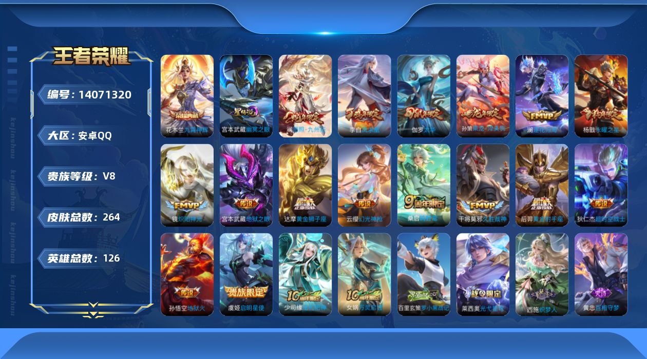 - [13107727]安卓Q-V0-最强王者段位-125英雄-255皮肤-0典藏-0珍品无双-0无双-0珍品传说-17传说-68史诗 【英雄全皮】:蒙恬全皮 【传说皮肤】:后羿神树通天,桑启鸣野蒿,典韦战鼓燎原,赵云乘龙铭钟鼎,马超琥珀纪元,澜逐花归海,宫本武藏惊梅引,曜山海苍雷引,李白诗剑行,马超无双飞将,镜炽阳神光,曜云鹰飞将,李信一念神魔,刘备时之恋人,达摩黄金狮子座,宫本武藏地狱之眼,狄仁杰超时空战士 【限定皮肤】:白起狰,姜子牙天穹之誓,狄仁杰阴阳师,虞姬凯尔特女王,赵云皇家上将,赵云引擎之心,嬴政优雅恋人,孙尚香蔷薇恋人,庄周高山流水,高渐离玩趣恶龙,钟无艳超时空战士,扁鹊炼金王,芈月重明,元歌无心,夏侯惇朔风刀,甄姬游园惊梦,甄姬落雪兰心,曹操烛龙,典韦穷奇,马可波罗暗影游猎,狄仁杰魔术师,狄仁杰万华元夜,达摩沙漠行僧,项羽海滩派对,老夫子醍醐杖,程咬金演武夺筹,韩信飞衡,兰陵王金庭之子,孙悟空至尊宝,牛魔御旌,刘备百相守梦,李元芳云中旅人,钟馗驱傩正仪,杨玉环遇见飞天,干将莫邪真爱魔法,雅典娜黎明之约,蔡文姬繁星吟游,太乙真人饕餮,鬼谷子原初探秘者,鬼谷子五谷丰年,苏烈千军破阵,百里玄策原初追逐者,弈星混沌棋,梦奇顽趣,沈梦溪大漠名商,明世隐疑决卦,裴擒虎李小龙,裴擒虎擒涛扼浪,狂铁御狮,米莱狄御霄,云中君纤云弄巧,盾山御銮,猪八戒西部大镖客,上官婉儿梁祝,曜山海苍雷引,鲁班大师探海日志,镜匿光追影者,桑启海盐诗旅,艾琳流音漫舞,赵怀真鹤归松栖,司空震地狱燃心,阿古朵江河有灵,张良古海寻踪,蒙恬荣光圣徽,鬼谷子天穹祈灯,马超琥珀纪元,赵云乘龙铭钟鼎,沈梦溪龙舞盛年,刘邦剑破天穹,镜青焰无极,项羽苍威无极,周瑜熔金海岸 【年限皮肤】:韩信飞衡,马超神威,曜山海苍雷引,赵云乘龙铭钟鼎 【赛季限定】:扁鹊炼金王,白起狰,芈月重明,夏侯惇朔风刀,曹操烛龙,典韦穷奇,狄仁杰万华元夜,达摩沙漠行僧,老夫子醍醐杖,程咬金演武夺筹,兰陵王金庭之子,张良古海寻踪,牛魔御旌,李元芳云中旅人,虞姬凯尔特女王,钟馗驱傩正仪,雅典娜黎明之约,太乙真人饕餮,鬼谷子原初探秘者,苏烈千军破阵,百里玄策原初追逐者,弈星混沌棋,梦奇顽趣,沈梦溪大漠名商,明世隐疑决卦,裴擒虎擒涛扼浪,狂铁御狮,米莱狄御霄,盾山御銮,鲁班大师探海日志,桑启海盐诗旅,鬼谷子天穹祈灯,蒙恬荣光圣徽,刘邦剑破天穹,姜子牙天穹之誓