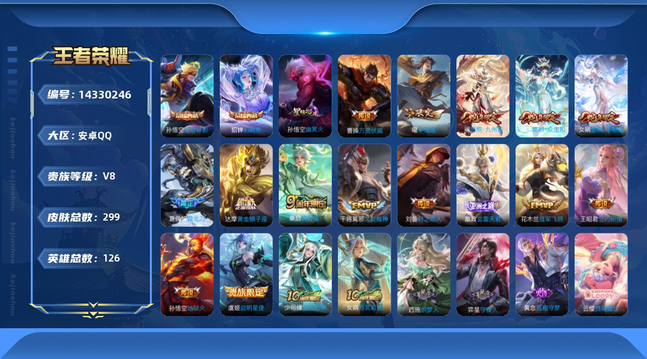 [14330246]【店主推荐捡漏号!可直接换绑】安卓Q-V8-最强王者段位-126英雄-299皮肤-2典藏皮肤-1星传说-17传说-75史诗