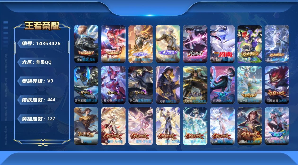 [14353426]【店主推荐捡漏号!可直接换绑】苹果Q-V9-最强王者段位-127英雄-444皮肤-2典藏皮肤-2无双-4珍品传说-3星传说-41传说-144史诗
