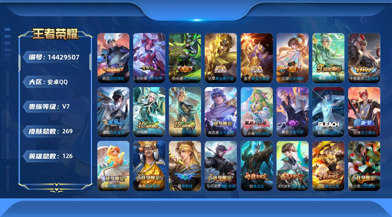 [14429507]可二次【店主推荐捡漏号!可直接换绑】安卓Q-V7-最强王者段位-126英雄-269皮肤-1典藏皮肤-1星传说-8传说-88史诗