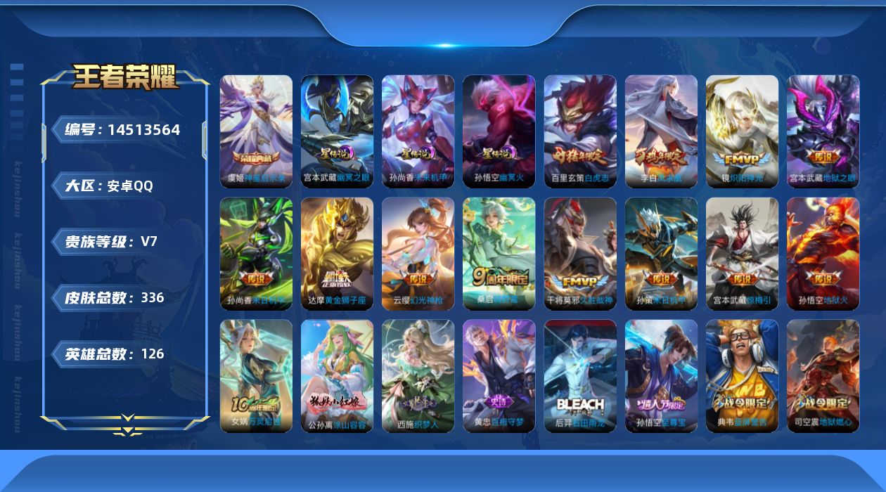 [14513564]【店主推荐捡漏号!可直接换绑】安卓Q-V7-最强王者段位-126英雄-336皮肤-1典藏皮肤-13传说-100史诗