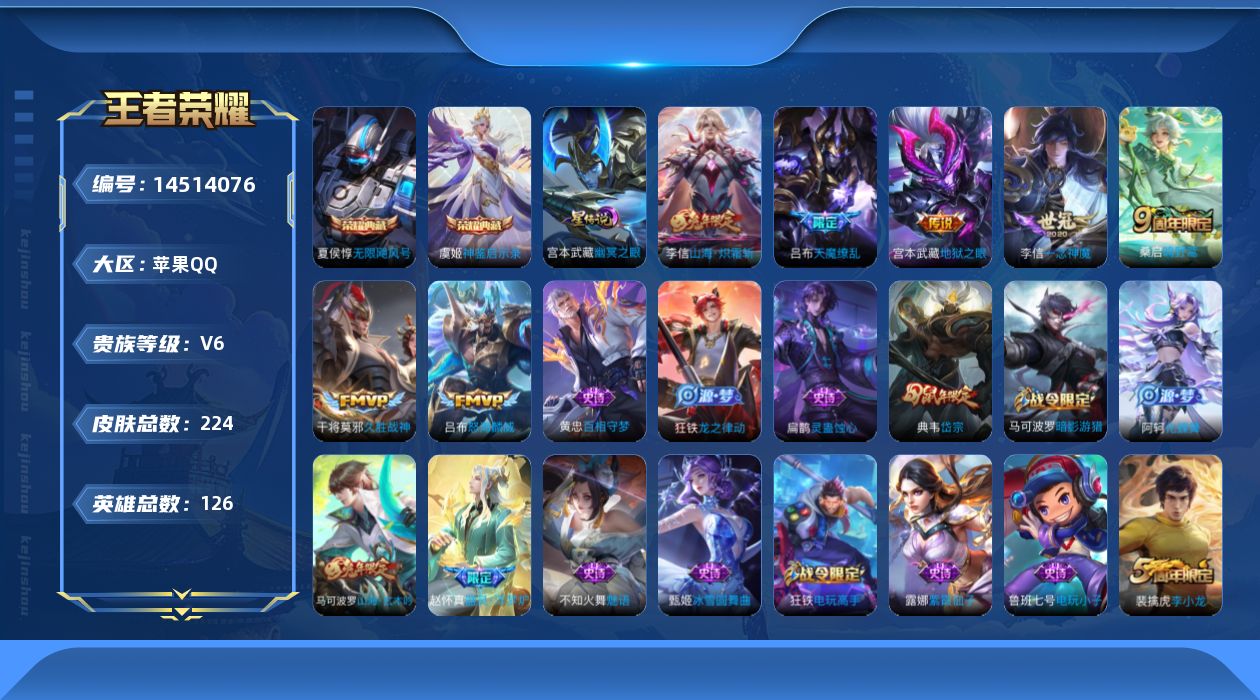 [14514076]【店主推荐捡漏号!可直接换绑】苹果Q-V6-最强王者段位-126英雄-224皮肤-2典藏皮肤-7传说-63史诗