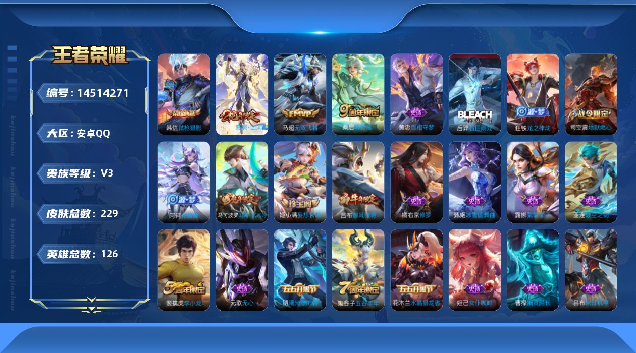 [14514271]【店主推荐捡漏号!可直接换绑】安卓Q-V3-最强王者段位-126英雄-229皮肤-1典藏皮肤-3传说-54史诗
