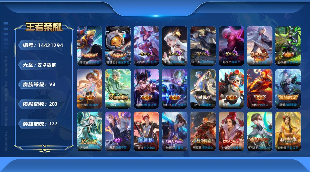 [14421294]安卓WX-V8-最强王者段位-127英雄-283皮肤-2典藏皮肤-11传说-64史诗-4星元