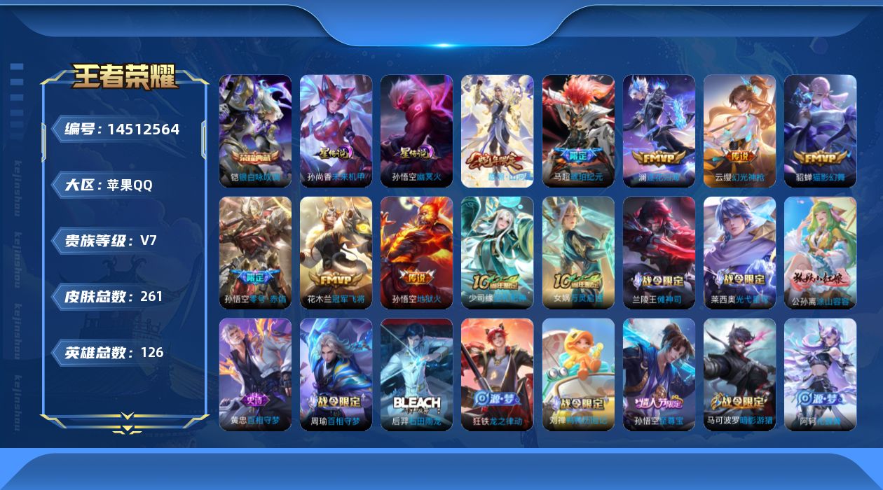 [14512564]可二次【店主推荐捡漏号!可直接换绑/4市标/2888星币兑换星元皮肤】:苹果Q-V7-最强王者段位-126英雄-261皮肤-1典藏皮肤-2星元-9传说-62史诗 【英雄全皮】:孙权全皮,钟馗全皮,空空儿全皮,影全皮 【荣耀典藏】:铠银白咏叹调 【传说皮肤】:后羿神树通天,司空震愿照山河定,云缨幻光神枪,马超琥珀纪元,澜逐花归海,孙悟空零号赤焰,貂蝉猫影幻舞,花木兰冠军飞将,孙悟空地狱火 【限定皮肤】:狄仁杰阴阳师,赵云皇家上将,墨子神迹守卫,孙尚香蔷薇恋人,鲁班七号狮舞东方,周瑜赤莲之焰,元歌云间偶戏,夏侯惇朔风刀,甄姬游园惊梦,马可波罗暗影游猎,狄仁杰魔术师,狄仁杰万华元夜,达摩星际陆战队,达摩沙漠行僧,项羽海滩派对,老夫子醍醐杖,老夫子航海奇遇记,程咬金演武夺筹,兰陵王驯魔猎人,亚瑟潮玩骑士王,孙悟空至尊宝,孙悟空零号赤焰,牛魔御旌,李元芳云中旅人,钟馗神迹守卫,钟馗驱傩正仪,杨玉环遇见飞天,雅典娜单词大作战,蔡文姬繁星吟游,鬼谷子原初探秘者,苏烈千军破阵,百里玄策原初追逐者,弈星混沌棋,沈梦溪大漠名商,明世隐疑决卦,裴擒虎李小龙,裴擒虎擒涛扼浪,云中君纤云弄巧,盾山御銮,猪八戒西部大镖客,上官婉儿梁祝,蒙犽狂想玩偶喵,鲁班大师探海日志,桑启海盐诗旅,艾琳流音漫舞,阿古朵江河有灵,张良古海寻踪,马超琥珀纪元 【赛季限定】:夏侯惇朔风刀,狄仁杰万华元夜,达摩沙漠行僧,老夫子醍醐杖,程咬金演武夺筹,张良古海寻踪,牛魔御旌,李元芳云中旅人,钟馗驱傩正仪,鬼谷子原初探秘者,苏烈千军破阵,百里玄策原初追逐者,弈星混沌棋,沈梦溪大漠名商,明世隐疑决卦,裴擒虎擒涛扼浪,盾山御銮,鲁班大师探海日志,桑启海盐诗旅 【战令限定】:墨子神迹守卫,鲁班七号狮舞东方,周瑜赤莲之焰,元歌云间偶戏,马可波罗暗影游猎,达摩星际陆战队,老夫子航海奇遇记,兰陵王驯魔猎人,艾琳流音漫舞,亚瑟潮玩骑士王,钟馗神迹守卫,雅典娜单词大作战,猪八戒西部大镖客,蒙犽狂想玩偶喵 【史诗皮肤】:阿轲暗夜猫娘,赵云皇家上将,甄姬冰雪圆舞曲,王昭君偶像歌手,狄仁杰魔术师,宫本武藏鬼剑武藏,孙尚香蔷薇恋人,孙尚香水果甜心,嬴政摇滚巨星,妲己魅力维加斯,妲己女仆咖啡,曹操幽灵船长,李白千年之狐,吕布末日机甲,张飞乱世虎臣,孙悟空至尊宝,夏侯惇乘风破浪,兰陵王暗隐猎兽者,诸葛亮黄金分割率,甄姬游园惊梦,雅典娜冰冠公主,安