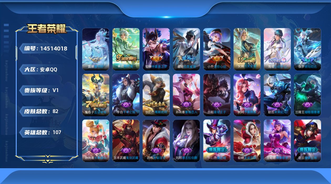 [14514018]可二次【店主推荐捡漏号!可直接换绑】:安卓Q-V6-永恒钻石II段位-107英雄-82皮肤-5传说-20史诗 【英雄全皮】:影全皮 【传说皮肤】:桑启鸣野蒿,露娜霜月吟,小乔音你心动,虞姬云霓雀翎,貂蝉仲夏夜之梦 【限定皮肤】:姜子牙天穹之誓,狄仁杰阴阳师,赵云皇家上将,孙尚香蔷薇恋人,狄仁杰魔术师,达摩沙漠行僧,项羽海滩派对,老夫子醍醐杖,兰陵王金庭之子,李元芳云中旅人,鬼谷子原初探秘者,鬼谷子五谷丰年,沈梦溪大漠名商,明世隐疑决卦,裴擒虎擒涛扼浪,鲁班大师探海日志,张良古海寻踪,鬼谷子天穹祈灯,伽罗琥珀纪元,沈梦溪龙舞盛年,刘邦剑破天穹,海诺心动手记 【赛季限定】:达摩沙漠行僧,老夫子醍醐杖,兰陵王金庭之子,张良古海寻踪,李元芳云中旅人,鬼谷子原初探秘者,沈梦溪大漠名商,明世隐疑决卦,裴擒虎擒涛扼浪,鲁班大师探海日志,鬼谷子天穹祈灯,刘邦剑破天穹,姜子牙天穹之誓 【史诗皮肤】:赵云皇家上将,赵云未来纪元,貂蝉圣诞恋歌,王昭君偶像歌手,狄仁杰魔术师,宫本武藏鬼剑武藏,孙尚香蔷薇恋人,孙尚香水果甜心,吕布圣诞狂欢,刘禅绅士熊喵,李白千年之狐,刘邦德古拉伯爵,兰陵王暗隐猎兽者,白起星夜王子,阿轲节奏热浪,狄仁杰鹰眼统帅,鬼谷子五谷丰年,伽罗琥珀纪元,海诺心动手记,女娲万灵启世 【其他皮肤】:项羽海滩派对,韩信教廷特使,韩信街头霸王,露娜哥特玫瑰,阿轲爱心护理,白起白色死神,姜子牙时尚教父,典韦黄金武士,达摩拳王,张飞五福同心,刘备万事如意,狄仁杰阴阳师,狂铁命运角斗场,诸葛亮掌控之力,吕布野性能量,明世隐疑决卦,老夫子醍醐杖,鬼谷子原初探秘者,刘禅秘密基地,鲁班大师乓乓大师,达摩沙漠行僧,兰陵王金庭之子,沈梦溪大漠名商,李元芳云中旅人,猪八戒潮玩探月行,裴擒虎擒涛扼浪,鲁班大师探海日志,张良古海寻踪,鬼谷子天穹祈灯,亚瑟鸿运当头,沈梦溪龙舞盛年,刘邦剑破天穹,姜子牙天穹之誓,东皇太一噬灭天穹,苍苍林狼骑,影魅影绮裳,艾琳鹤鸣心笺,高渐离金属狂潮,狄仁杰锦衣卫,孙悟空西部大镖客,后羿精灵王,钟馗地府判官,李元芳特种部队,虞姬加勒比小姐,马可波罗激情绿茵,杨戬埃及法老,诸葛亮星航指挥官,百里守约绝影神枪,梦奇美梦成真,公孙离花间舞,伽罗花见巫女,李信灼热之刃,曜归虚梦演,马超幸存者,镜冰刃幻境,澜孤猎,云缨赤焰之缨 【内测皮肤】:孙尚香蔷薇恋人 【营地ID】:17260