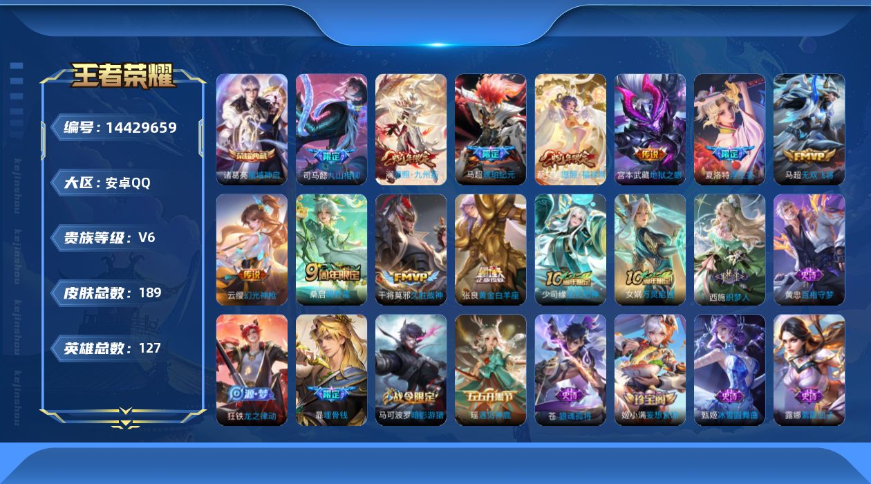 - [14353109]可二次,【店主推荐捡漏号!可直接换绑】安卓Q-V8-尊贵铂金II段位-124英雄-217皮肤-21传说-53史诗 【传说皮肤】:露娜霜月吟,宫本武藏惊梅引,孙悟空齐天大圣,李白诗剑行,娜可露露前尘镜,孙尚香音你闪耀,赵云淬星耀世,公孙离祈雪灵祝,铠绛天战甲,虞姬启明星使,孙悟空零号赤焰,关羽武圣,李信一念神魔,伽罗太华,貂蝉猫影幻舞,张良黄金白羊座,虞姬云霓雀翎,梦奇胖达荣荣,诸葛亮武陵仙君,李白凤求凰,孙尚香末日机甲 【限定皮肤】:狄仁杰阴阳师,虞姬凯尔特女王,赵云皇家上将,妲己时之彼端,嬴政白昼王子,孙尚香蔷薇恋人,鲁班七号狮舞东方,高渐离死亡摇滚,阿轲迷踪丽影,钟无艳王者之锤,钟无艳超时空战士,扁鹊炼金王,白起夜都怪侠,芈月重明,吕布猎兽之王,周瑜赤莲之焰,元歌云间偶戏,元歌无心,夏侯惇朔风刀,甄姬游园惊梦,甄姬落雪兰心,典韦穷奇,典韦蓝屏警告,狄仁杰魔术师,狄仁杰万华元夜,达摩沙漠行僧,项羽海滩派对,老夫子醍醐杖,关羽冰锋战神,关羽武圣,安琪拉魔法小厨娘,程咬金演武夺筹,刘邦夺宝奇兵,韩信飞衡,兰陵王驯魔猎人,兰陵王金庭之子,娜可露露前尘镜,亚瑟潮玩骑士王,孙悟空至尊宝,孙悟空零号赤焰,孙悟空齐天大圣,牛魔御旌,后羿辉光之辰,李元芳银河之约,李元芳云中旅人,虞姬启明星使,钟馗神迹守卫,钟馗驱傩正仪,女娲朔望之晖,蔡文姬繁星吟游,太乙真人华丽摇滚,东皇太一逐梦之光,鬼谷子原初探秘者,诸葛亮武陵仙君,铠青龙志,苏烈千军破阵,百里守约朱雀志,弈星混沌棋,梦奇顽趣,公孙离祈雪灵祝,沈梦溪星空之诺,沈梦溪大漠名商,明世隐疑决卦,明世隐吟游魔法,裴擒虎天狼狩猎者,裴擒虎李小龙,裴擒虎擒涛扼浪,狂铁御狮,米莱狄御霄,云中君纤云弄巧,伽罗太华,盾山御銮,上官婉儿梁祝,鲁班大师探海日志,桑启海盐诗旅,张良古海寻踪,蒙犽百解令,鬼谷子天穹祈灯,姬小满妄想食味,关羽决胜骁骑 【年限皮肤】:百里守约朱雀志,铠青龙志,李白凤求凰,后羿辉光之辰,公孙离祈雪灵祝,伽罗太华,韩信飞衡,关羽武圣 【赛季限定】:扁鹊炼金王,芈月重明,夏侯惇朔风刀,典韦穷奇,狄仁杰万华元夜,达摩沙漠行僧,老夫子醍醐杖,程咬金演武夺筹,兰陵王金庭之子,张良古海寻踪,牛魔御旌,李元芳云中旅人,虞姬凯尔特女王,钟馗驱傩正仪,鬼谷子原初探秘者,苏烈千军破阵,弈星混沌棋,梦奇顽趣,沈梦溪大漠名商,明世隐疑决卦,裴擒虎擒