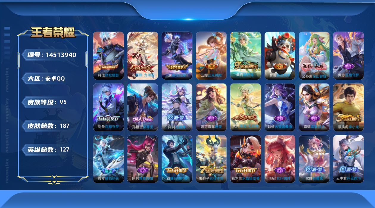 - [11297732]V7 1典藏 12传说 125英雄 264皮肤 可修改实名 优质装备:幻阙歌(貂蝉典藏),黄金狮子座,冠军飞将,一念神魔,零号·赤焰,地狱之眼,时之恋人-刘备(电焊工),音你闪耀(rap皮),鹤归松栖(云缨) 传说皮:云诺千山,幻光神枪 珍宝阁皮:优雅恋人,女武神 限定皮:愿照·千秋盛(女娲年限),至尊宝,白虎志(电光耗子),神威(电光马子),遇见飞天,高山流水,五谷丰年,冰锋战神,梁祝,御风骁将(吕布年限),烈魂,李小龙,如梦令-后羿,猪悟能,大圣娶亲 史诗皮:飞车小橘子,器灵·浮梦炉,化蝶舞,雪豹·霜爪,电玩小子(小书包),千年之狐,完美假期,匿光侦查者,偶像歌手,龙骑士(小龙虾),乱世虎臣,节奏热浪,修罗,女仆咖啡,摇滚巨星,水果甜心,时之奇旅-安琪拉,功夫厨神,德古拉伯爵,暗隐猎兽者,幽灵船长,鬼剑武藏,心灵战警,舞动绿茵,地狱岩魂,纤云弄巧,繁星吟游(呼啦呼啦),逐浪之夏,水晶猎龙者,金属风暴,原初追逐者,圣诞恋歌,鹰眼统帅,魅力维加斯,黎明之约,未来纪元-赵云