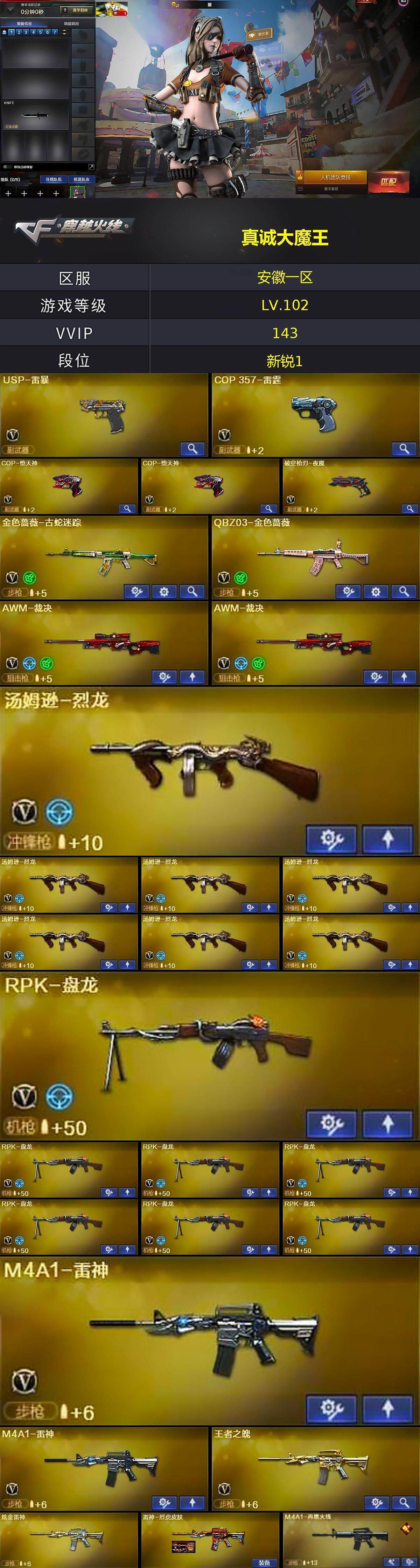 [14815489]安徽一区-140V-9王者-5炫金 【热门武器】:QBZ03-金色蔷薇,金色蔷薇-古蛇迷踪,修罗-古蛇迷踪,死亡之眼*2,M4A1-黑骑士*8,汤姆逊-烈龙*7,RPK-盘龙*7,加特林-炼狱,斯泰尔-蝴蝶,USP-雷暴,COP-堕天神*2,沙鹰-修罗*5 【王者炫金武器】:炼狱-悦蓝,炫金雷神,炫金超新星,炫金毁灭,炫金天龙,炫金修罗 【音效卡】:Barrett-毁灭音效卡,Barrett-