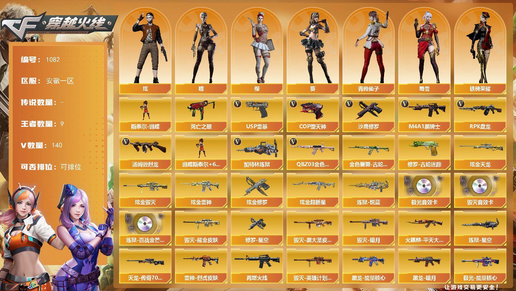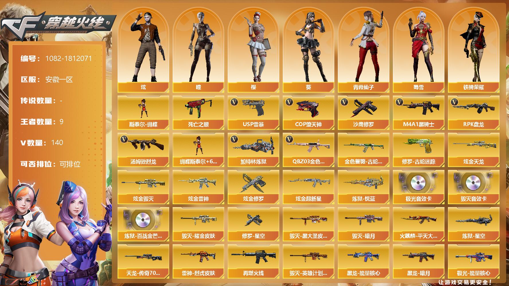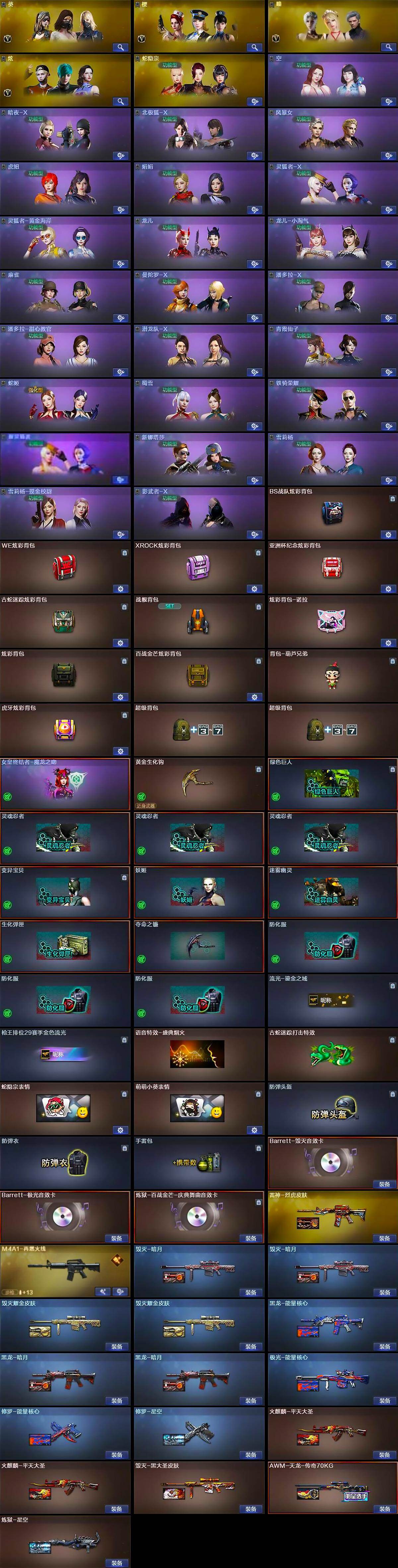 - [14732933]上海一区-106V-6王者-1炫金 【热门武器】:QBZ03-金色蔷薇,Scar Light-白虎*3,HK417-朱雀,M200-幻神,M200-竞技荣光,死亡之眼,荣耀世冠-火麒麟,荣耀世冠-雷神,白虎-电玩蓝兔,QBZ03-街机,荣耀世冠-柯尔特*2,Kar98K-星神,M4A1-黑骑士*5,汤姆逊-烈龙*6,RPK-盘龙*2,斯泰尔-蝴蝶,USP-雷暴*2,沙鹰-修罗*4,荣耀世冠-龙啸 【王者炫金武器】:炫金骑士 【音效卡】:M200-幻神音效卡,M4A1-黑骑士音效卡,Barrett-毁灭音效卡 【皮肤】:M200-幻神-黄忠皮肤,幻神-冠军之幻,幻神-巅峰荣耀,白虎-电玩粉兔皮肤,雷神-暗月,雷神-荣耀之魄,雷神-虎将,雷神-传奇N9,M4A1-战神赵云,雷神-荣耀世冠AG,雷神-机甲刑天皮肤,雷神-宇航兔皮肤,雷神-维纳斯皮肤,火麒麟-冠军之心,火麒麟-华夏之心*2,AK47-火麒麟-传奇EVEN,传奇石头-横秒之巅,火麒麟-平天大圣*3,火麒麟-荣耀世冠AG,火麒麟-心动糖果,毁灭-暗月,毁灭-荣耀之怒,毁灭-冠军之怒,毁灭-SV-CFPLS16冠军,M4A1-黑龙-361,黑龙-冠军之武,黑骑士-冠军之势,死神-机甲核心皮肤,战神-粉色甜心皮肤,战神-紫绶金章皮肤*3,战神-流金岁月皮肤,AK47-B-常胜将军-孙权*2,天龙-能量核心,AWM-天龙-传奇70KG,AWM-天龙-传奇白鲨,极光-能量核心,炼狱-玩具枪皮肤,修罗-能量核心,天神-宇航兔皮肤,麒麟刺-萌杀皮肤,麒麟刺-月皮肤 【角色】:电竞教官-云悠悠,审判者,王者春,奇洋探员,乔伊教练,云海玲珑,暗夜-X,初恋灵狐,芳心审判者,风暴女,虎妞,嘉年华灵狐,兰妹妹,猎狐者-追月,灵狐-花神,灵狐者-X,灵狐者-七夕宝贝,龙儿,龙儿-小淘气,麻雀,曼陀罗-X,曼陀罗-礼服,萌儿,潘多拉-X,青霞仙子,斯沃特-X,铁骑荣耀,兔囡囡,维纳斯,新娜塔莎,雪莉杨-摸金校尉,夜玫瑰-幻能朋克,樱-战斗天使,游珑儿 【人偶武器】:火麒麟-灵狐*2,斯泰尔-蝴蝶,AWM-灵狐-15周年嘉年华,迷你深渊冰龙*2,迷你裂空之翼,迷你波特博士,夺魂,迷你火种,生化手雷-机甲核心,深渊终结者手雷*2,迷你艾比,迷你超能女侍,迷你巨石泰坦-魔花研究所 【暴走生化】:死亡之眼,超级对讲机 【挑战大师】:冰龙粉碎