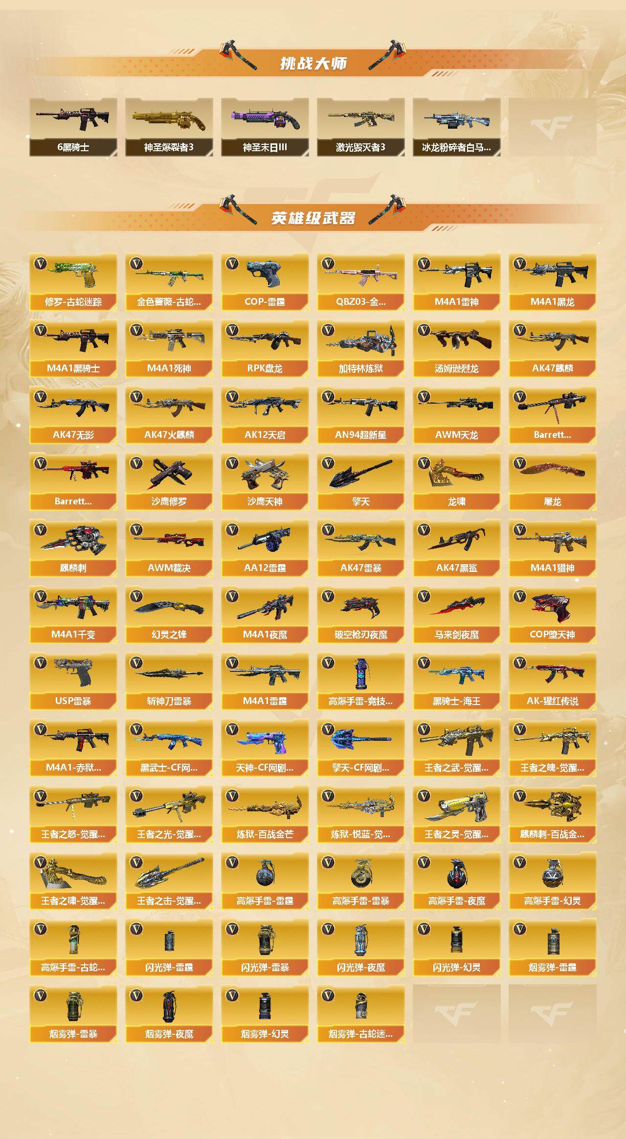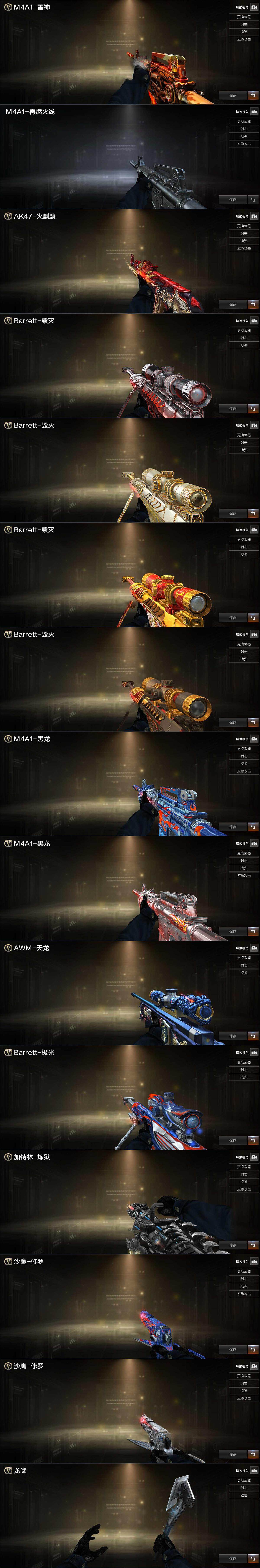 【热门武器】:QBZ03-金色蔷薇,金色蔷薇-古蛇迷踪,修罗-古蛇迷踪,死亡之眼*2,M4A1-黑骑士*8,汤姆逊-烈龙*7,RPK-盘龙*7,加特林-炼狱,斯泰尔-蝴蝶,USP-雷暴,COP-堕天神*2,沙鹰-修罗*5