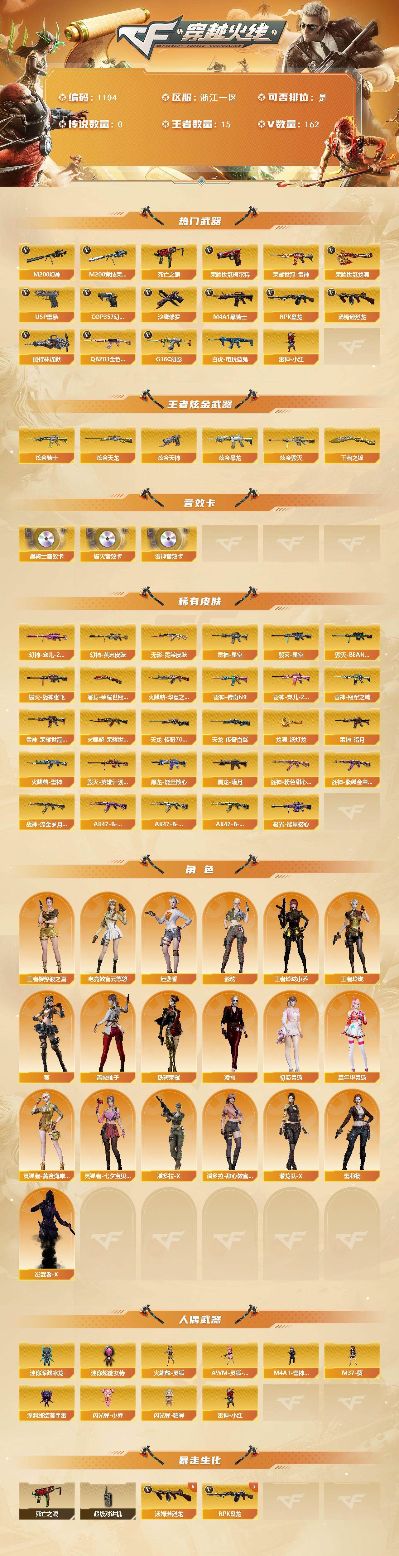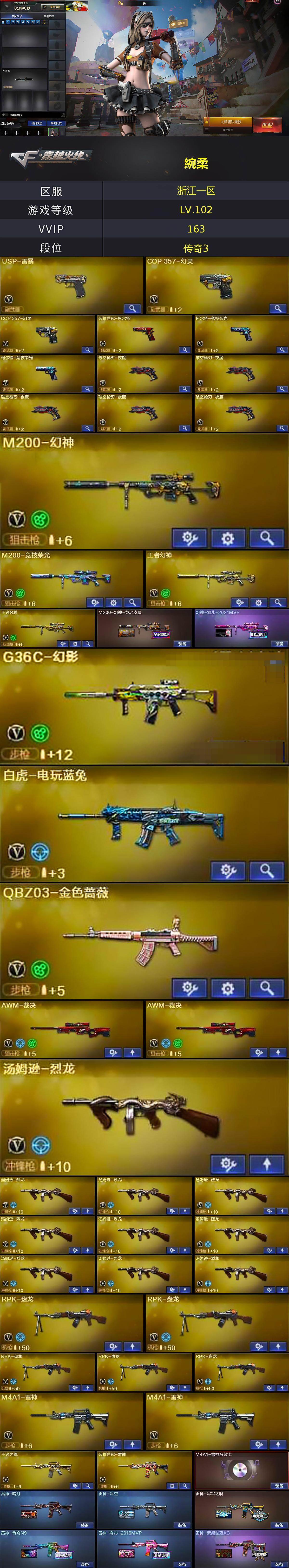 [14816229]浙江一区-162V-15王者-9炫金 【热门武器】:G36C-幻影,QBZ03-金色蔷薇,M200-幻神,M200-竞技荣光,死亡之眼,荣耀世冠-雷神,白虎-电玩蓝兔,荣耀世冠-柯尔特,M4A1-黑骑士*6,汤姆逊-烈龙*10,RPK-盘龙*5,加特林-炼狱*3,雷神-小红,USP-雷暴,COP 357-幻灵*2,沙鹰-修罗*4,荣耀世冠-龙啸 【王者炫金武器】:王者之锋*4,炫金骑士*2,炫