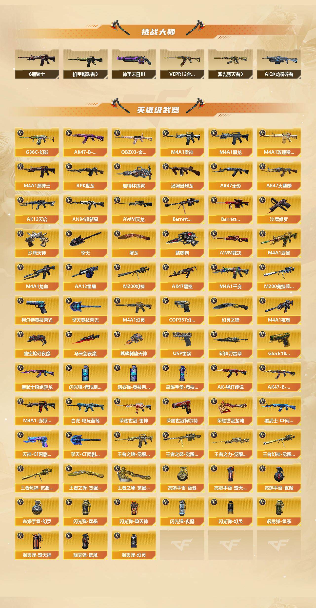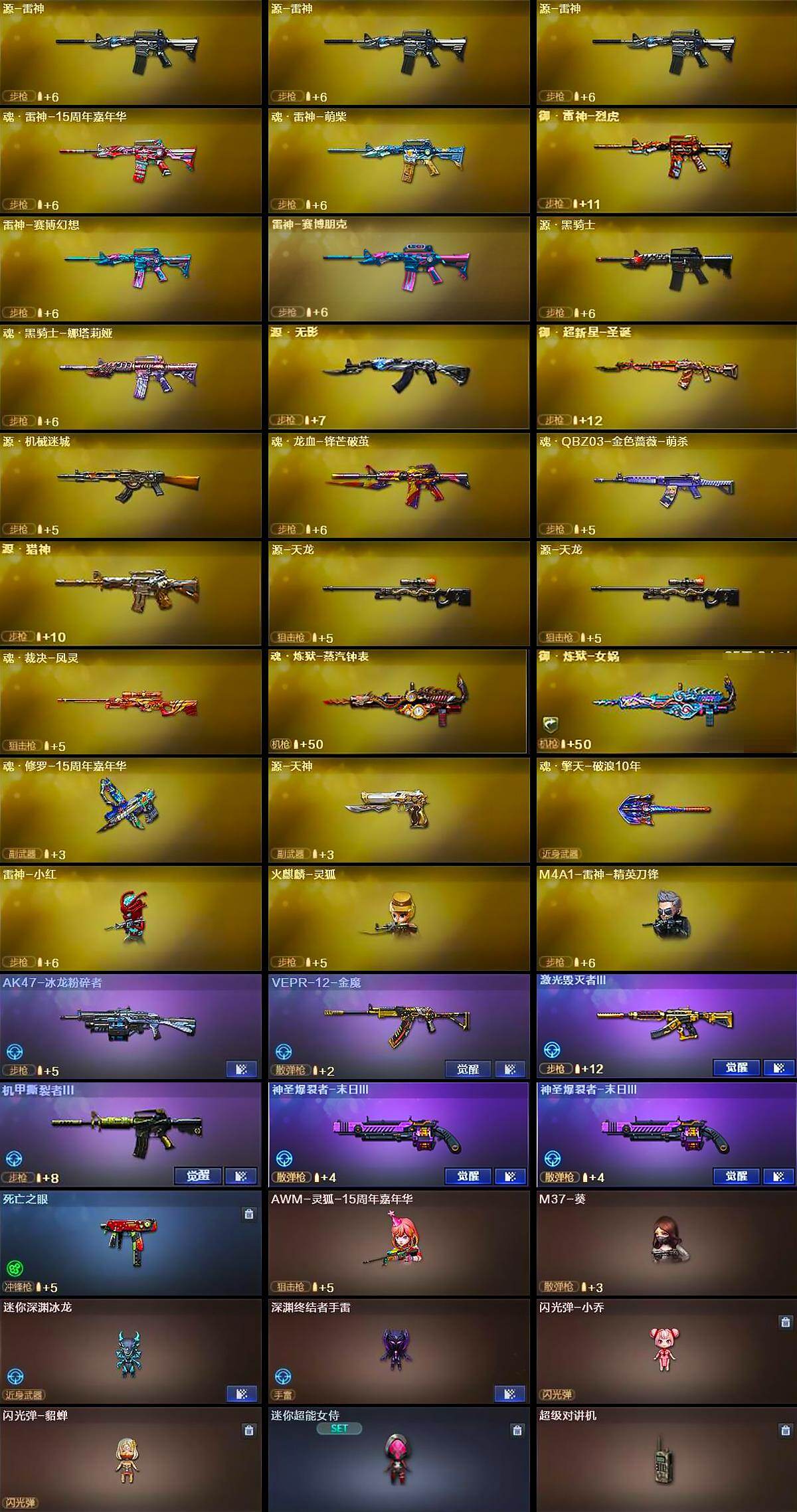 【热门武器】:G36C-幻影,QBZ03-金色蔷薇,M200-幻神,M200-竞技荣光,死亡之眼,荣耀世冠-雷神,白虎-电玩蓝兔,荣耀世冠-柯尔特,M4A1-黑骑士*6,汤姆逊-烈龙*10,RPK-盘龙*5,加特林-炼狱*3,雷神-小红,USP-雷暴,COP 357-幻灵*2,沙鹰-修罗*4,荣耀世冠-龙啸