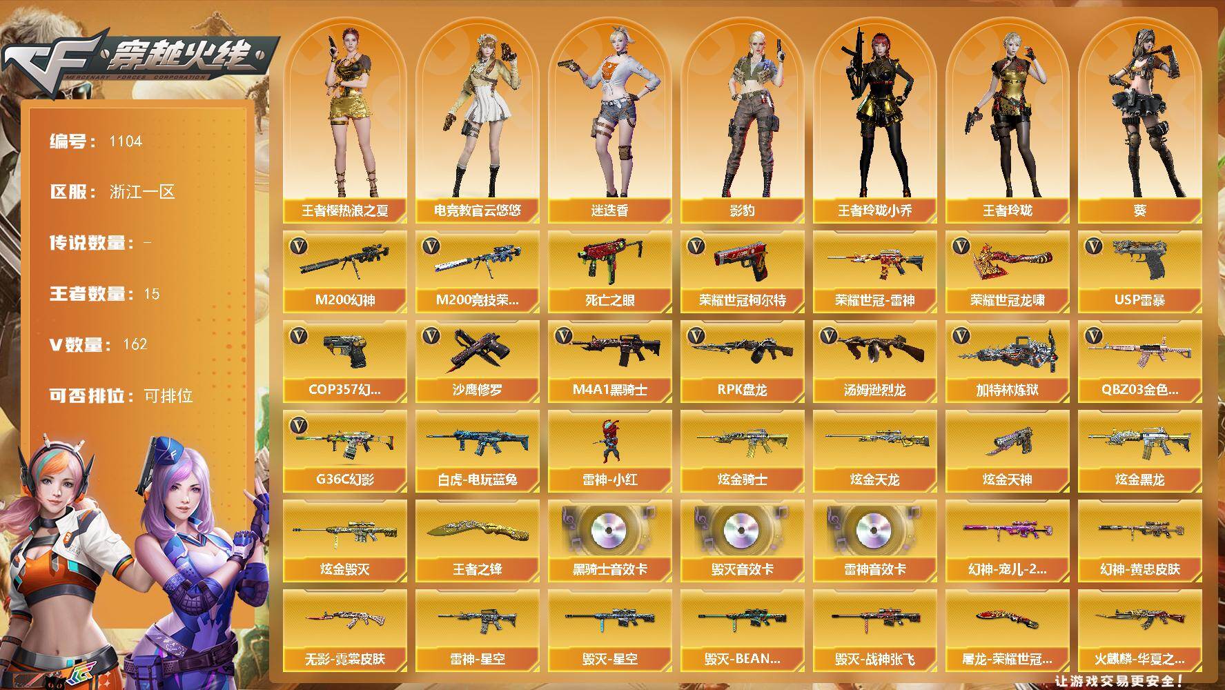 - [12740964]陕西一区-151V-16王者-2炫金 【热门武器】:QBZ03-金色蔷薇,Scar Light-白虎,HK417-朱雀,M200-幻神,死亡之眼,王者炎心,C.A.T,M4A1-黑骑士*5,汤姆逊-烈龙*8,RPK-盘龙*6,加特林-炼狱*2,COP-白鲨,USP-雷暴,COP-堕天神*2,沙鹰-修罗*3 【王者炫金武器】:炫金毁灭,炫金雷神,王者之城,王者冰魄,王者炎心,王者之翼,王者之怒 【音效卡】:AK47-火麒麟音效卡*2,M4A1-黑骑士音效卡,Barrett-毁灭音效卡 【稀有皮肤】:雷神-星空,M4A1-战神赵云,AK47-火麒麟-传奇EVEN,毁灭-冠军之怒 【角色】:王者-葵-貂蝉,王者-零,灵狐者-职业经理,炫,迷迭香,蜀雪,铁骑荣耀 【人偶武器】:COP-白鲨,巴雷特-零-水下丽影*2,M37-葵,COP-旗袍*2,C.A.T,迷你深渊冰龙*2,迷你裂空之翼*5,迷你生化手雷,闪光弹-小乔,闪光弹-貂蝉,高爆手雷-大乔 【暴走生化】:死亡之眼,超级对讲机 【挑战大师】:机甲撕裂者III,神圣爆裂者-末日III,激光毁灭者III,AK47-冰龙粉碎者,暴君乱世-超越Max 【英雄级武器】:幻灵之锋,M4A1-堕天神,COP-堕天神*2,麒麟刺-堕天神,龙啸-堕天神,USP-雷暴,斩神刀-雷暴,M4A1-雷霆,M4A1-武圣,Glock18-武圣,QBZ03-金色蔷薇,Scar Light-白虎,HK417-朱雀,M4A1-雷神,M4A1-黑龙*3,M4A1-玫瑰精灵,M4A1-黑骑士*5,M4A1-死神,RPK-盘龙*6,加特林-炼狱*2,汤姆逊-烈龙*8,AK47-火麒麟*2,AK47-黑武士,AK12-天启*3,AN94-超新星,Barrett-毁灭*2,Barrett-极光*3,AWM-裁决,AK47-机械迷城,AA-12-雷霆,Barrett-朱雀,M200-幻神,AK47-黑鲨*2,AK47-B-战神,AK47-B-常胜将军,沙鹰-天神,沙鹰-修罗*3,麒麟刺,擎天*2,屠龙*6 【特殊枪械】:1白虎,5黑骑士,6烈龙,6盘龙,2炼狱