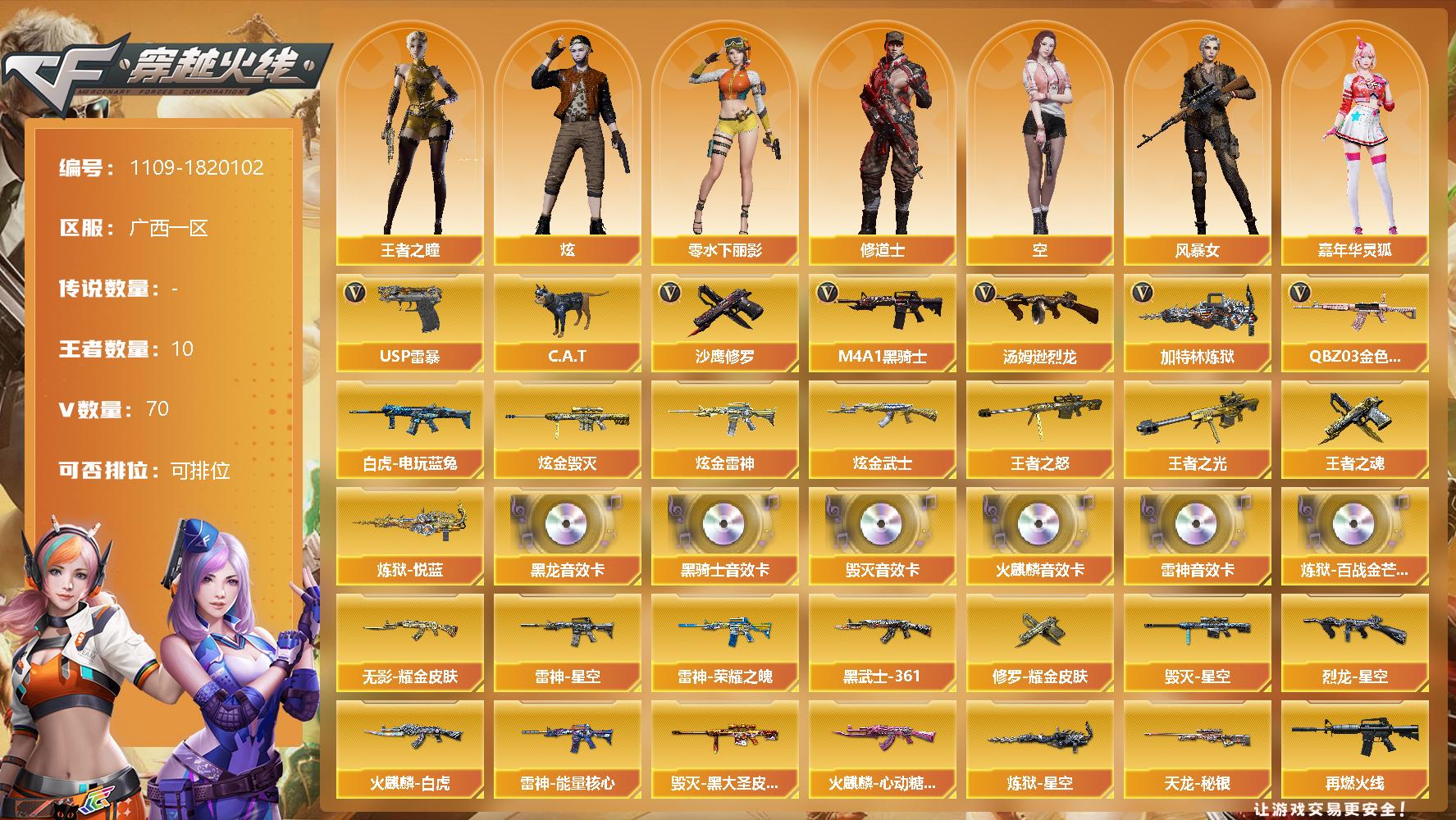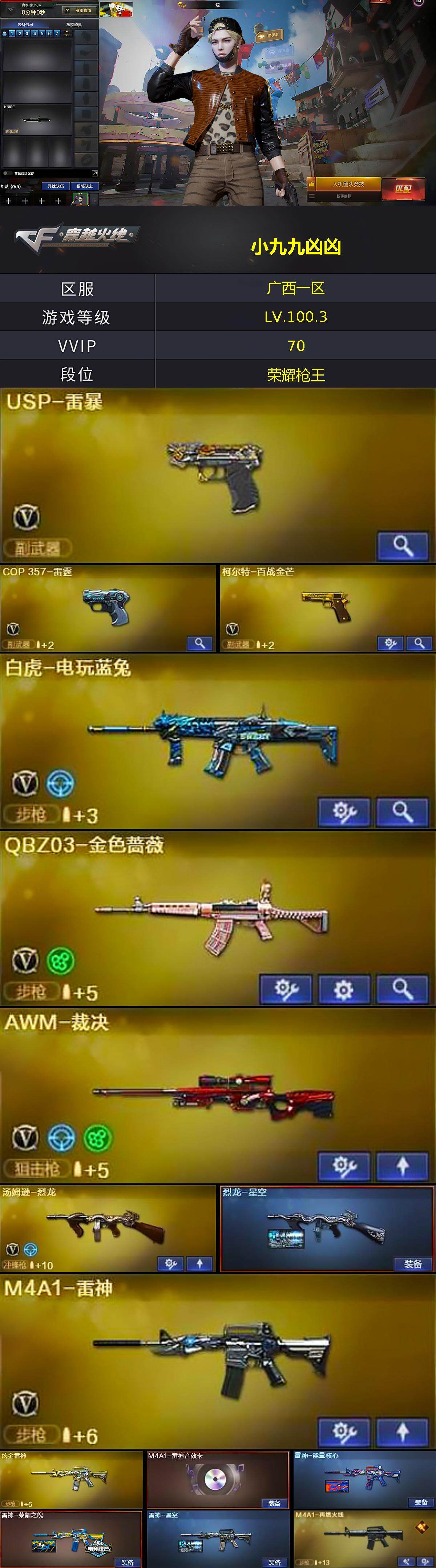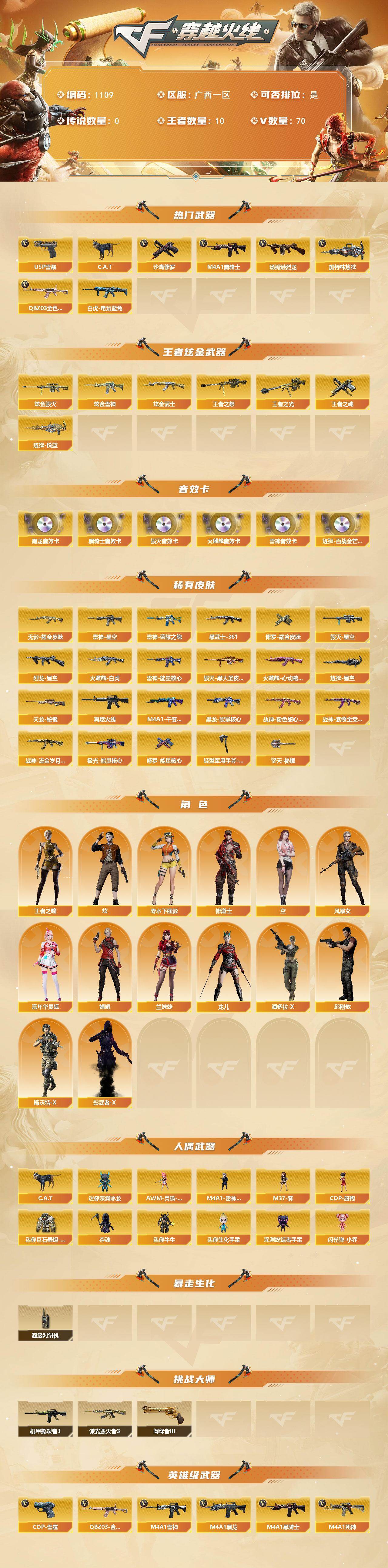 [14816732]广西一区-70V-10王者-3炫金 【热门武器】:QBZ03-金色蔷薇,白虎-电玩蓝兔,C.A.T,M4A1-黑骑士*2,汤姆逊-烈龙,加特林-炼狱*2,USP-雷暴,沙鹰-修罗 【王者炫金武器】:王者之光,王者之怒,炼狱-悦蓝,王者之魂,炫金雷神,炫金武士,炫金毁灭 【音效卡】:AK47-火麒麟音效卡,M4A1-雷神音效卡,M4A1-黑龙音效卡,M4A1-黑骑士音效卡,Barrett-毁灭音