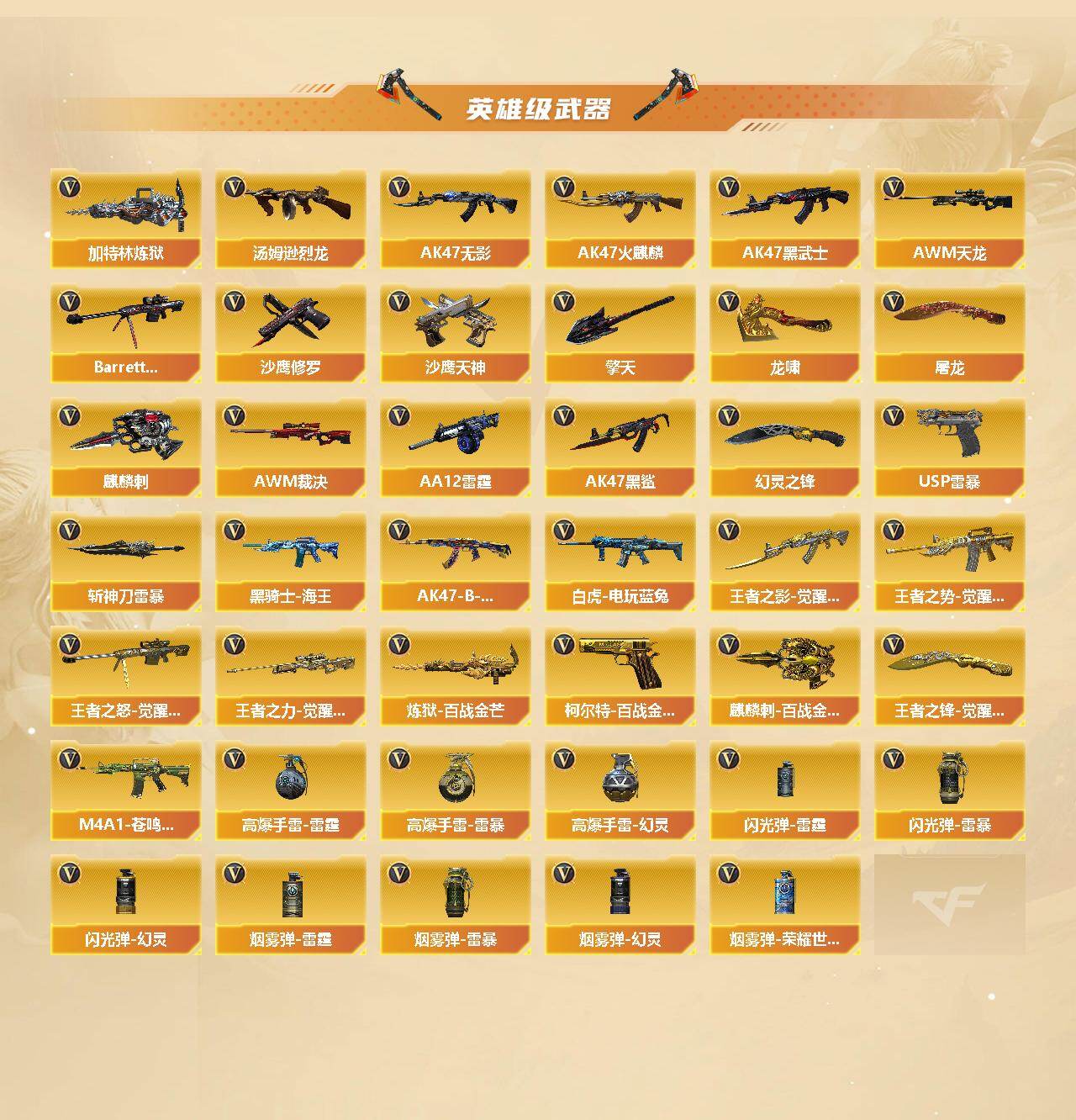 【热门武器】:QBZ03-金色蔷薇,白虎-电玩蓝兔,C.A.T,M4A1-黑骑士*2,汤姆逊-烈龙,加特林-炼狱*2,USP-雷暴,沙鹰-修罗