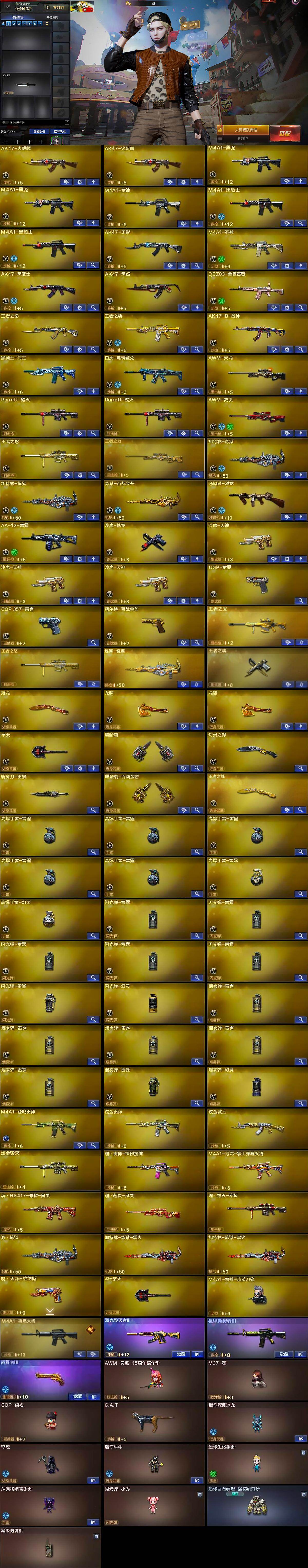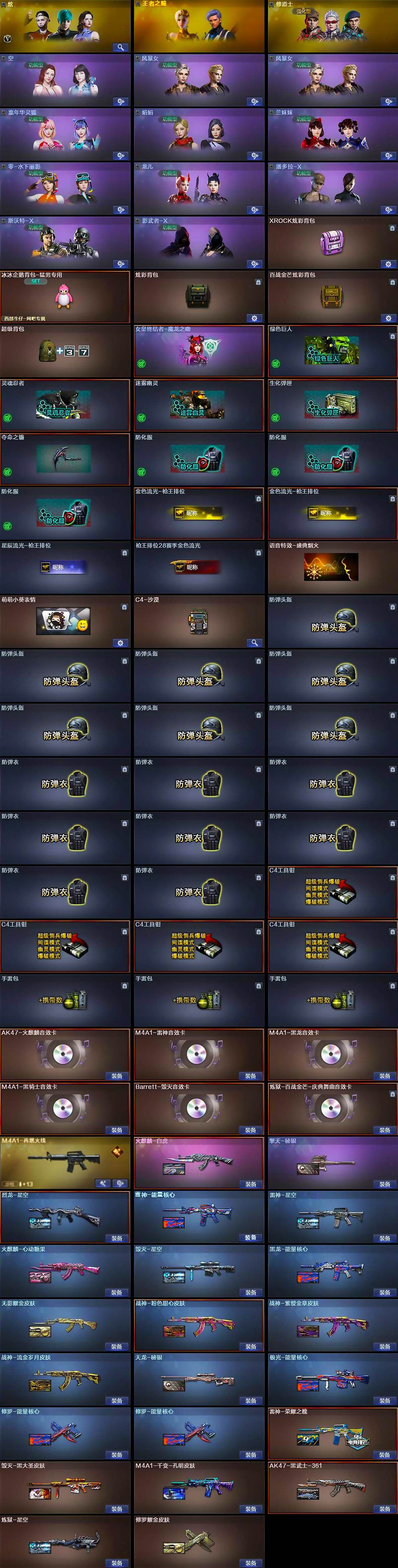 - [14542711]北方大区-33V-7王者-0炫金 【传说武器】:传说梦魇 【热门武器】:传说梦魇,QBZ03-金色蔷薇,M14EBR-玄武,Scar Light-白虎,M200-竞技荣光,白虎-电玩蓝兔,M4A1-黑骑士,USP-雷暴,沙鹰-修罗 【王者炫金武器】:王者芳薇 【音效卡】:M4A1-黑骑士音效卡 【皮肤】:雷神-机甲刑天皮肤,雷神-宇航兔皮肤,雷神-维纳斯皮肤,火麒麟-平天大圣,毁灭-暗月,战神-紫绶金章皮肤*2,战神-流金岁月皮肤,AK47-B-常胜将军-刘备*2,AK47-B-常胜将军-孙权,屠龙-荣耀之锋 【角色】:电竞教官-云悠悠,修道士,暗夜-X,初恋灵狐,电竞少女,芳心审判者,飞虎队-X,风暴女,虎妞,嘉年华灵狐,娟娟,葵-赛博朋克,兰妹妹,猎狐者-追月,灵狐者-X,灵狐者-七夕宝贝,潘多拉-X,潘多拉-甜心教官,潜龙队-X,青霞仙子,斯沃特-X,兔囡囡,新娜塔莎,夜玫瑰-宠粉,幽,游珑儿 【人偶武器】:AWM-灵狐-15周年嘉年华,迷你波特博士,夺魂*2,迷你牛牛*2,深渊终结者手雷,迷你超能女侍 【暴走生化】:超级对讲机 【挑战大师】:激光毁灭者III-白马银枪*2,激光毁灭者III,试炼破坏者III,神圣爆裂者-末日III 【英雄级武器】:AK47-火麒麟,M4A1-黑龙,M4A1-雷神,M4A1-黑骑士,AK47-黑鲨,Scar Light-白虎,M14EBR-玄武,无影-神兵利器,黑武士-锦绣游龙,QBZ03-金色蔷薇,天启-悦智-觉醒版,AK47-B-战神,王者冰魄-觉醒版,白虎-电玩蓝兔,M200-竞技荣光,王者星神-觉醒版,王者风神-觉醒版,沙鹰-修罗,USP-雷暴,柯尔特-竞技荣光,COP 357-云龙,屠龙,麒麟刺,擎天-竞技荣光,斩神刀-雷暴,王者之锋-觉醒版,高爆手雷-雷暴,高爆手雷-竞技荣光,高爆手雷-云龙,闪光弹-雷暴,闪光弹-竞技荣光,闪光弹-云龙,烟雾弹-雷暴,烟雾弹-竞技荣光,烟雾弹-云龙*2 【道具】:CFS限定背包,亚洲杯纪念炫彩背包,沙漠龙背包-猛男专属,超级背包,绿色巨人,灵魂忍者,迷雾幽灵,生化弹匣,夺命之镰,防化服*3,金色流光-枪王排位*2,星辰流光-枪王排位,巅峰赛先锋-金色流光,枪王排位28赛季金色流光,枪王排位29赛季金色流光,电玩兔兔表情,EP战队名片,EP战队喷图,C4-黑曜,防弹头盔*5,防弹衣