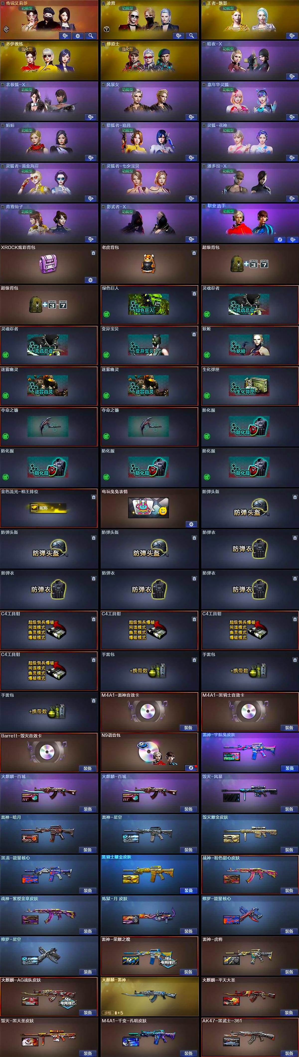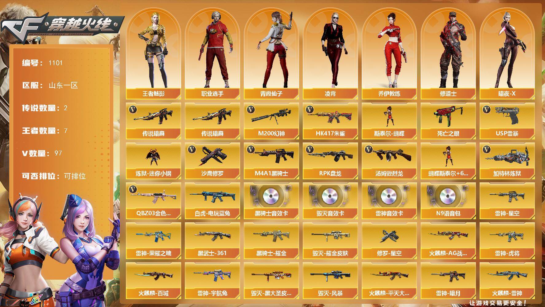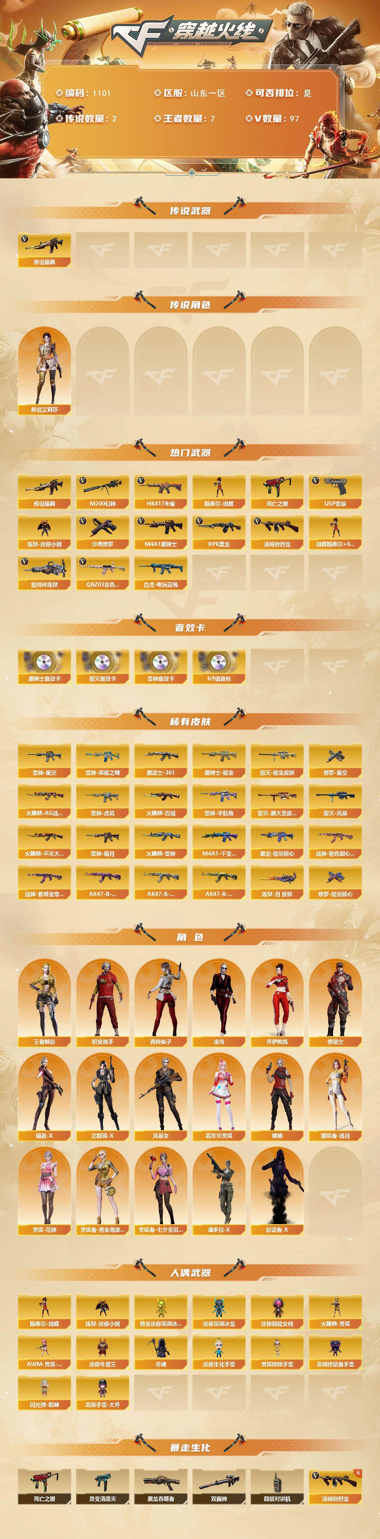 - [14602371]山东一区-30V-4王者-1炫金 【热门武器】:Scar Light-白虎*2,M200-竞技荣光,白虎-电玩蓝兔,M4A1-黑骑士,汤姆逊-烈龙*6,斯泰尔-蝴蝶,USP-雷暴,沙鹰-修罗 【王者炫金武器】:炫金雷神 【音效卡】:AK47-火麒麟音效卡,M4A1-雷神音效卡 【皮肤】:战神-流金岁月皮肤,AK47-B-常胜将军-曹操,AK47-B-常胜将军-刘备,AK47-B-常胜将军-孙权 【角色】:电竞教官-云悠悠,鹰,初恋灵狐,嘉年华灵狐,娟娟,灵狐者-X,麻雀,潘多拉-X,潜龙队-X,铁骑荣耀,新娜塔莎,职业选手 【人偶武器】:斯泰尔-蝴蝶,AWM-灵狐-15周年嘉年华,迷你深渊冰龙*2,迷你裂空之翼,迷你牛魔王,迷你波特博士*3,夺魂,迷你牛牛,迷你火种,深渊终结者手雷,闪光弹-貂蝉,高爆手雷-大乔,迷你艾比,迷你超能女侍,迷你巨石泰坦-魔花研究所 【暴走生化】:超级对讲机 【挑战大师】:暴君乱世-超越Max,试炼破坏者III,神圣爆裂者-末日III,阐释者III,惩戒者III 【英雄级武器】:AK47-火麒麟,M4A1-黑骑士,Scar Light-白虎*2,王者之武-觉醒版,AK-47-猩红传说*2,黑骑士-海王,AK47-B-常胜将军,白虎-电玩蓝兔,M200-竞技荣光,王者之怒-觉醒版,王者星神-觉醒版,汤姆逊-烈龙*6,沙鹰-修罗,USP-雷暴,柯尔特-竞技荣光,屠龙,擎天,擎天-竞技荣光,高爆手雷-竞技荣光,闪光弹-竞技荣光,烟雾弹-竞技荣光 【道具】:超级背包,黄金巨石泰坦-魔花研究所背包,变异宝贝,生化弹匣,夺命之镰,防化服,金色流光-枪王排位*2,星辰流光-枪王排位,电玩兔兔表情,防弹头盔*5,防弹衣*5,C4工具钳*3,手雷包*3 【特殊枪械】:蝴蝶斯泰尔+6烈龙,2白虎,1黑骑士,6烈龙,1蝴蝶斯泰尔