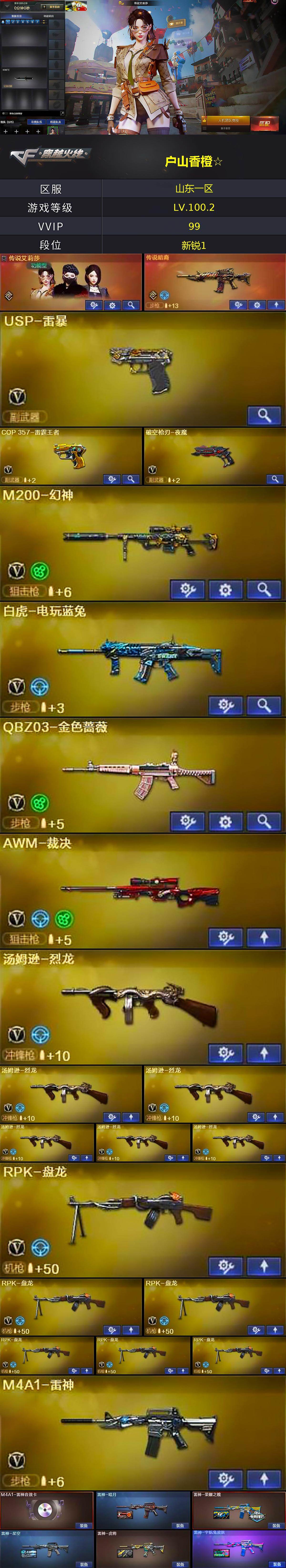 [14823629]山东一区-97V-7王者-0炫金 【传说武器】:传说暗裔 【传说角色】:传说艾莉莎 【热门武器】:传说暗裔,QBZ03-金色蔷薇,HK417-朱雀,M200-幻神,死亡之眼,白虎-电玩蓝兔,炼狱-迷你小钢,M4A1-黑骑士*2,汤姆逊-烈龙*6,RPK-盘龙*6,加特林-炼狱,斯泰尔-蝴蝶,USP-雷暴,沙鹰-修罗*3 【音效卡】:M4A1-雷神音效卡,M4A1-黑骑士音效卡,Barrett-