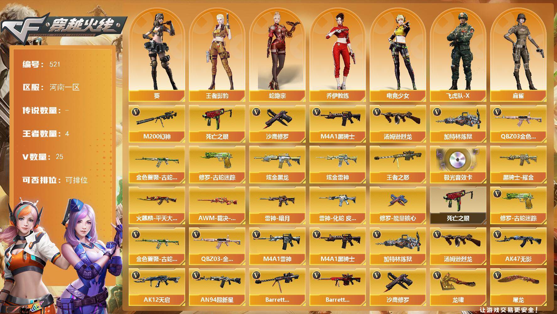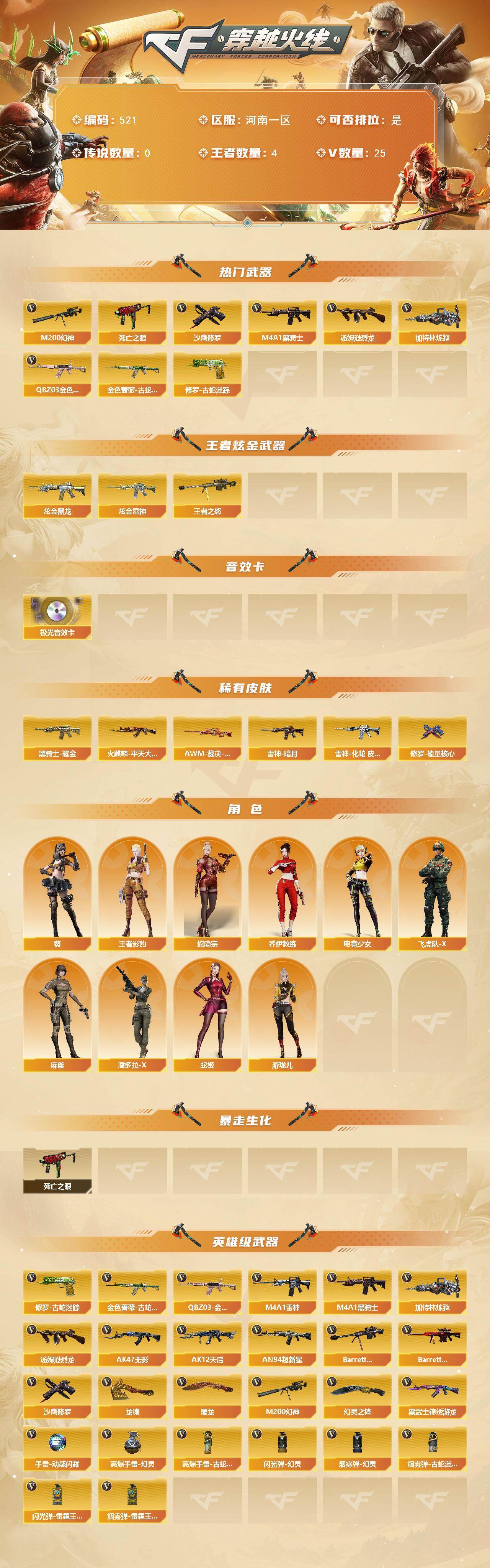 [14824193]河南一区-25V-4王者-2炫金 【热门武器】:QBZ03-金色蔷薇,M200-幻神,金色蔷薇-古蛇迷踪,修罗-古蛇迷踪,死亡之眼,M4A1-黑骑士,汤姆逊-烈龙,加特林-炼狱,沙鹰-修罗 【王者炫金武器】:王者之怒,炫金黑龙,炫金雷神 【音效卡】:Barrett-极光音效卡 【皮肤】:AWM-裁决-凤灵皮肤,雷神-暗月,雷神-化蛇 皮肤,火麒麟-平天大圣,黑骑士耀金皮肤,修罗-能量核心 【角色】:葵,王者影豹,蛇隐宗,乔伊教练,电竞少女,飞虎队-X,麻雀,潘多拉-X,蛇姬,游珑儿 【暴走生化】:死亡之眼 【英雄级武器】:M4A1-雷神,M4A1-黑骑士,AK47-无影,AK12-天启,AN94-超新星,黑武士-锦绣游龙,金色蔷薇-古蛇迷踪,QBZ03-金色蔷薇,Barrett-毁灭,Barrett-极光,M200-幻神,加特林-炼狱,汤姆逊-烈龙,沙鹰-修罗,修罗-古蛇迷踪,屠龙,龙啸*3,幻灵之锋,高爆手雷-幻灵,手雷-动感闪耀,高爆手雷-古蛇迷踪,闪光弹-幻灵,闪光弹-雷霆王者-觉醒版,烟雾弹-幻灵,烟雾弹-古蛇迷踪,烟雾弹-雷霆王者-觉醒版 【道具】:CFS限定背包,亚洲杯纪念炫彩背包,古蛇迷踪炫彩背包,超级背包,绿色巨人,灵魂忍者,变异宝贝,生化弹匣,夺命之镰,防化服*3,金色流光-枪王排位*2,星辰流光-枪王排位,枪王排位28赛季金色流光,枪王排位29赛季金色流光,古蛇迷踪打击特效,蛇隐宗表情,EP战队名片,EP战队喷图,EP战队击杀图标,防弹头盔*5,防弹衣*5,C4工具钳*4,手雷包*4 【特殊枪械】:1黑骑士,1烈龙,1炼狱