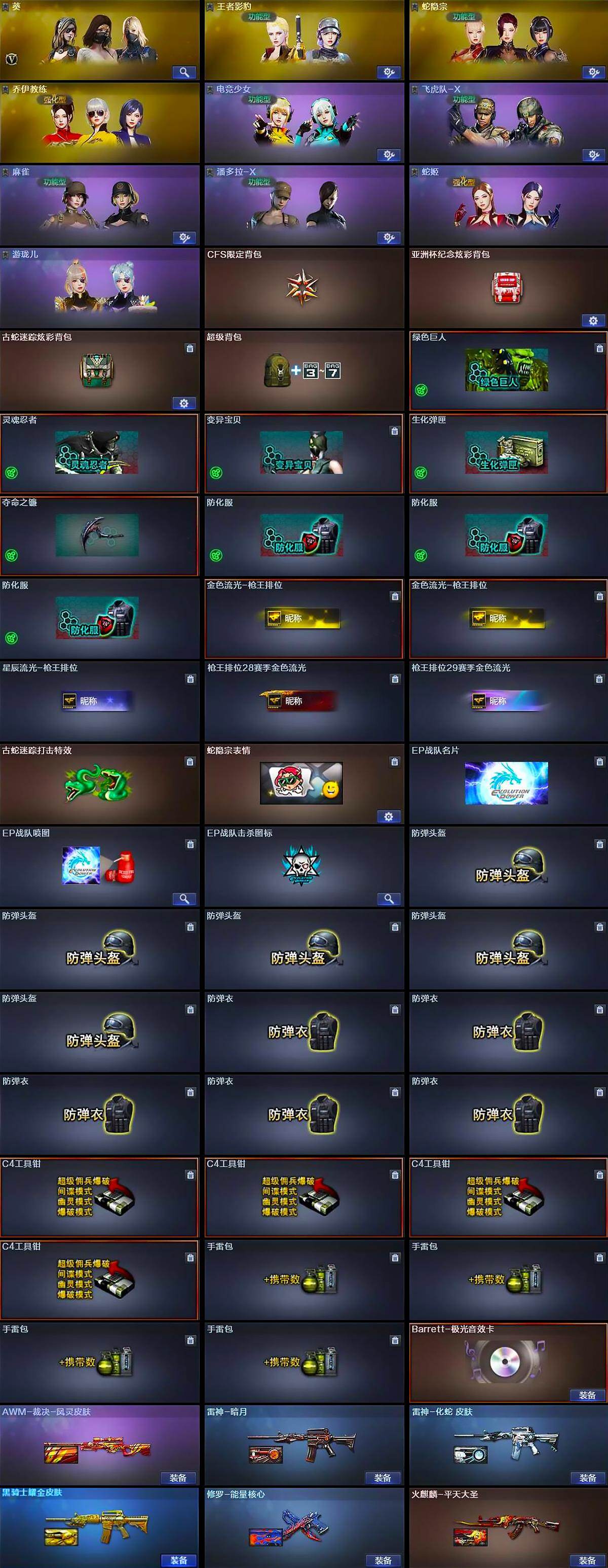 【道具】:CFS限定背包,亚洲杯纪念炫彩背包,古蛇迷踪炫彩背包,超级背包,绿色巨人,灵魂忍者,变异宝贝,生化弹匣,夺命之镰,防化服*3,金色流光-枪王排位*2,星辰流光-枪王排位,枪王排位28赛季金色流光,枪王排位29赛季金色流光,古蛇迷踪打击特效,蛇隐宗表情,EP战队名片,EP战队喷图,EP战队击杀图标,防弹头盔*5,防弹衣*5,C4工具钳*4,手雷包*4