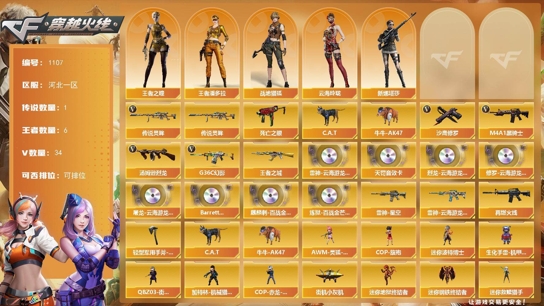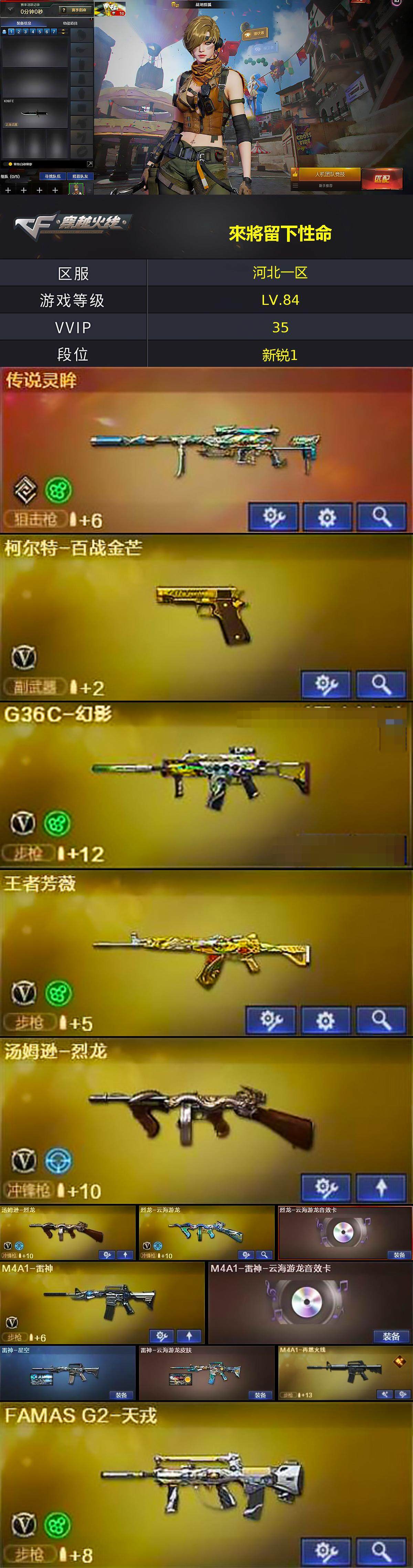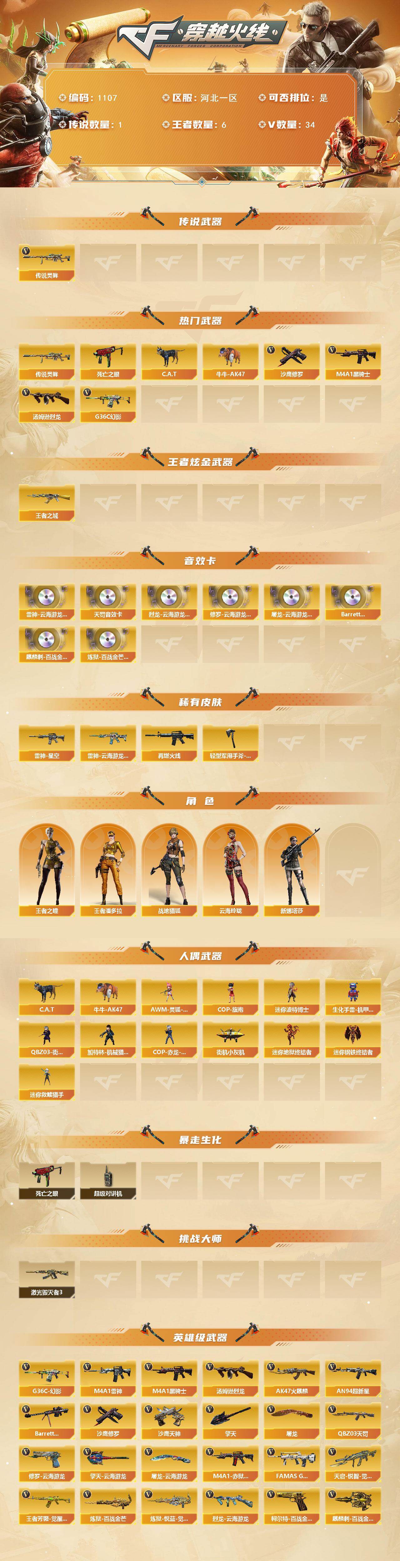[14824790]河北一区-34V-6王者-0炫金 【传说武器】:传说灵眸 【热门武器】:传说灵眸,G36C-幻影,死亡之眼,C.A.T,牛牛-AK47,M4A1-黑骑士,汤姆逊-烈龙*2,沙鹰-修罗 【王者炫金武器】:王者之城 【音效卡】:烈龙-云海游龙音效卡,修罗-云海游龙音效卡,屠龙-云海游龙音效卡,M4A1-雷神-云海游龙音效卡,QBZ03-天罚音效卡,Barrett-碧霄极光音效卡,麒麟刺-百战金芒-盛典舞曲音效卡,炼狱-百战金芒-庆典舞曲音效卡 【皮肤】:雷神-星空,雷神-云海游龙皮肤,M4A1-再燃火线,轻型军用手斧-再燃火线 【角色】:战地猎狐,王者之瞳,王者潘多拉,云海玲珑,新娜塔莎 【人偶武器】:QBZ03-街机-飒爽刀锋,迷你钢铁终结者,迷你救赎猎手,加特林-机械猎手,COP-赤龙-刀锋,街机小灰机,迷你地狱终结者,AWM-灵狐-15周年嘉年华,COP-旗袍,C.A.T,牛牛-AK47,迷你波特博士,生化手雷-机甲核心 【暴走生化】:死亡之眼,超级对讲机 【挑战大师】:激光毁灭者III 【英雄级武器】:AK47-火麒麟,M4A1-雷神,M4A1-黑骑士,AN94-超新星,QBZ03-天罚,G36C-幻影,FAMAS G2-天戎,天启-悦智-觉醒版,王者芳薇-觉醒版,Barrett-毁灭,炼狱-百战金芒,炼狱-悦蓝-觉醒版,汤姆逊-烈龙*2,烈龙-云海游龙,沙鹰-修罗,沙鹰-天神*3,柯尔特-百战金芒,修罗-云海游龙,屠龙*4,擎天,擎天-云海游龙,麒麟刺-百战金芒,屠龙-云海游龙,手雷-云海游龙,M4A1-赤狱骑士,Barrett-碧霄极光 【道具】:BS战队炫彩背包,云山科技背包,云海游龙炫彩背包,次元之矛-黄金背包,炫彩背包,百战金芒炫彩背包,超级背包,圣拳猎手-炽雪,女皇终结者-魔龙之吻,救世主-黑桃战神,绿色巨人,灵魂忍者,迷雾幽灵,夺命之镰,防化服*3,金色流光-枪王排位,星辰流光-枪王排位,流光-鎏金之域,流光-再燃火线,语音特效-盛典烟火,萌萌小葵表情,云海游龙表情,防弹头盔*3,防弹衣*3,C4工具钳*3,手雷包*3 【特殊枪械】:1黑骑士,2烈龙