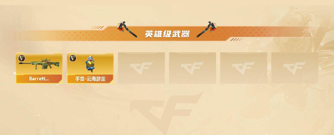 【英雄级武器】:AK47-火麒麟,M4A1-雷神,M4A1-黑骑士,AN94-超新星,QBZ03-天罚,G36C-幻影,FAMAS G2-天戎,天启-悦智-觉醒版,王者芳薇-觉醒版,Barrett-毁灭,炼狱-百战金芒,炼狱-悦蓝-觉醒版,汤姆逊-烈龙*2,烈龙-云海游龙,沙鹰-修罗,沙鹰-天神*3,柯尔特-百战金芒,修罗-云海游龙,屠龙*4,擎天,擎天-云海游龙,麒麟刺-百战金芒,屠龙-云海游龙,手雷-云海游龙,M4A1-赤狱骑士,Barrett-碧霄极光