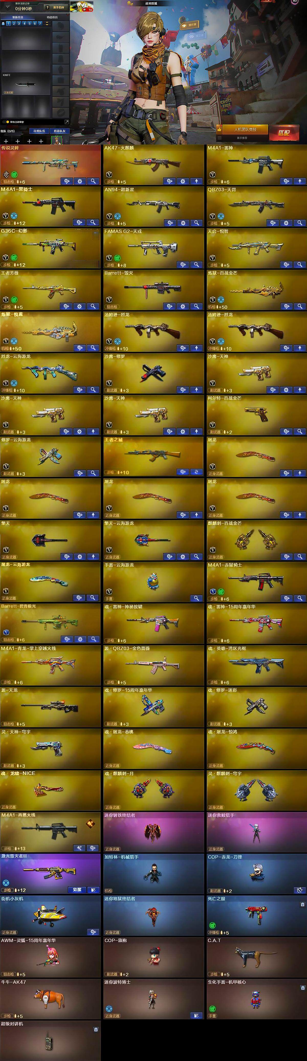 - [13227860]辽宁一区-41V-2王者-0炫金 【热门武器】:QBZ03-金色蔷薇,M200-竞技荣光,死亡之眼*2,白虎-电玩蓝兔,M4A1-黑骑士,加特林-炼狱,USP-雷暴,沙鹰-修罗*5 【音效卡】:炼狱-百战金芒-庆典舞曲音效卡 【皮肤】:雷神-能量核心,M4A1-再燃火线,火麒麟-心动糖果,黑龙-能量核心,黑骑士-暗月*2,无影-暗月*2,天龙-秘银,天神-暗月*2,轻型军用手斧-再燃火线 【角色】:葵,樱,电竞教官-云悠悠,战地猎狐,乔伊教练,初恋灵狐,电竞少女,飞虎队-X,兰妹妹,0号玩家,零-水下丽影,灵狐者-X,龙儿,潘多拉-甜心教官,青霞仙子,斯沃特-X,游珑儿 【人偶武器】:生化手雷-机甲核心*2 【暴走生化】:死亡之眼*2,超级对讲机 【挑战大师】:激光毁灭者III-白马银枪 【英雄级武器】:AK47-火麒麟*2,M4A1-黑龙,M4A1-雷神,M4A1-黑骑士,黑武士-锦绣游龙,QBZ03-金色蔷薇,王者之影-觉醒版,王者之烈-觉醒版,白虎-电玩蓝兔,AWM-天龙,Barrett-毁灭,M200-竞技荣光,加特林-炼狱,炼狱-百战金芒,沙鹰-修罗*5,沙鹰-天神,USP-雷暴,柯尔特-竞技荣光,屠龙,龙啸,擎天,麒麟刺,擎天-竞技荣光,麒麟刺-百战金芒,高爆手雷-竞技荣光*3,闪光弹-竞技荣光*2,烟雾弹-竞技荣光*2,M4A1-赤狱骑士 【特殊枪械】:1黑骑士,1炼狱