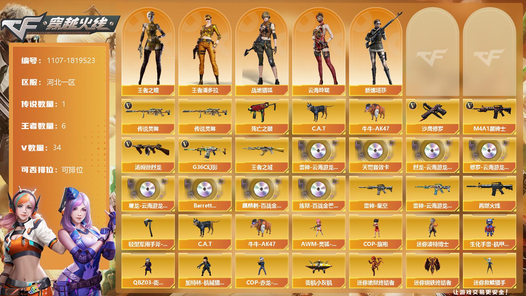 [14824793]河北一区-34V-6王者-0炫金 【传说武器】:传说灵眸 【热门武器】:传说灵眸,G36C-幻影,死亡之眼,C.A.T,牛牛-AK47,M4A1-黑骑士,汤姆逊-烈龙*2,沙鹰-修罗 【王者炫金武器】:王者之城 【音效卡】:烈龙-云海游龙音效卡,修罗-云海游龙音效卡,屠龙-云海游龙音效卡,M4A1-雷神-云海游龙音效卡,QBZ03-天罚音效卡,Barrett-碧霄极光音效卡,麒麟刺-百战金芒-